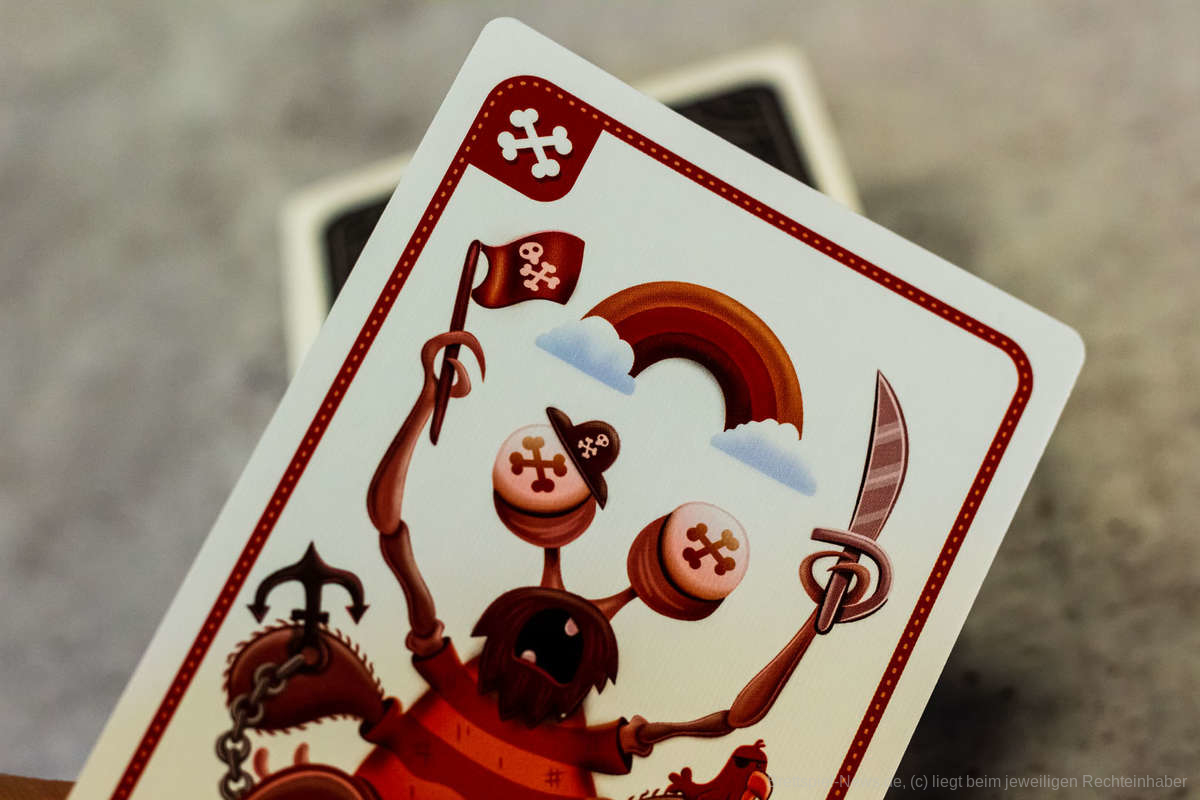 Die ist gut gelungen, aber es wurde nur so hochgesprungen wie nötig. Es gibt sieben Farben bei 105 Karten. Jede Farbe ist nur mit der gleichen Illustration versehen. Also wurden neben dem Cover nur sieben weitere plus eine für die Anleitungsgrafik gestaltet. Das dürfte die Produktionskosten deutlich gedrückt haben, zumal für eine Box mal eben 18 € aufgerufen werden. Jedes Skatspiel hat mehr Illustrationen und ist deutlich günstiger.