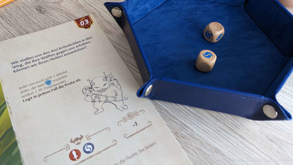 „DreamQuest“ hat mich direkt angesprochen und beim Spielen sofort überzeugt. Wer früher Abenteuerbücher mit Entscheidungen wie „Willst du dich auf die morsche Holzbrücke wagen (Seite X) oder suchst du einen anderen Weg (Seite Y)?“ gelesen und gemocht hat, wird sich wunderbar heimisch fühlen. Diese Mechanik alleine macht allerdings noch kein gutes Spiel. Das großartige Spielgefühl resultiert hier für mich aus der Kombination vieler Aspekte.