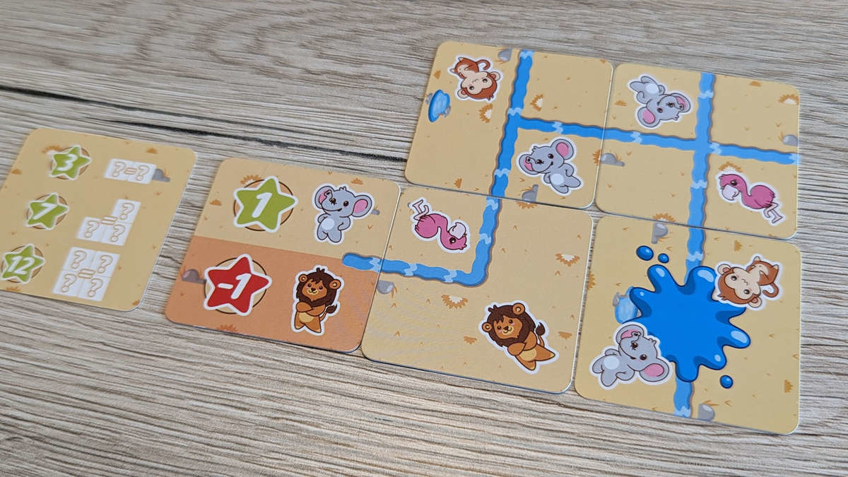 Clever gelöst ist die Mechanik der Hinweise auf den Rückseiten der Flussplättchen. Immer drei Tiere sind hier abgebildet, jedoch nur zwei davon werden letztlich auf der Vorderseite zu sehen sein. Somit haben die Kinder hier je nach Level der Startkarte verschiedene Konstellationen zu beachten.