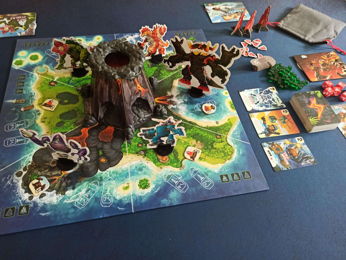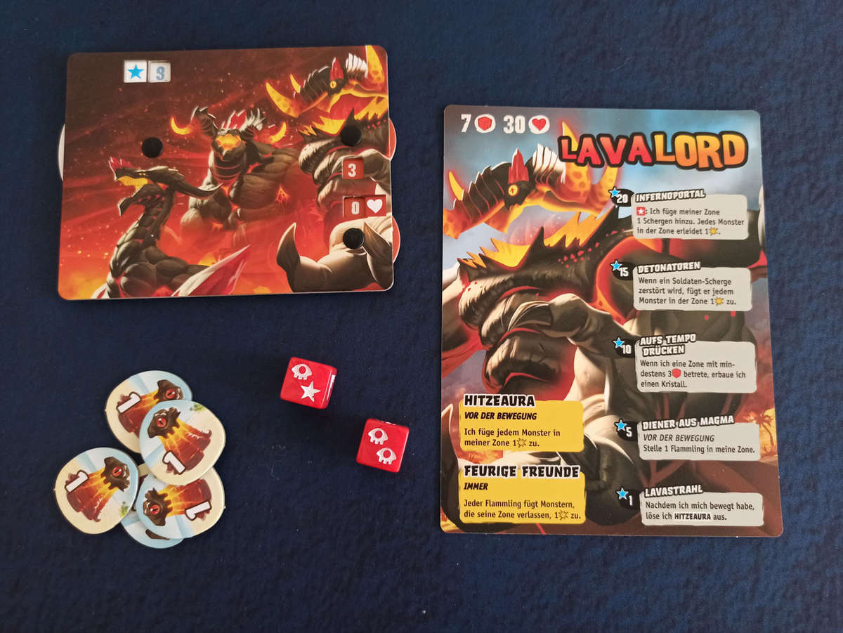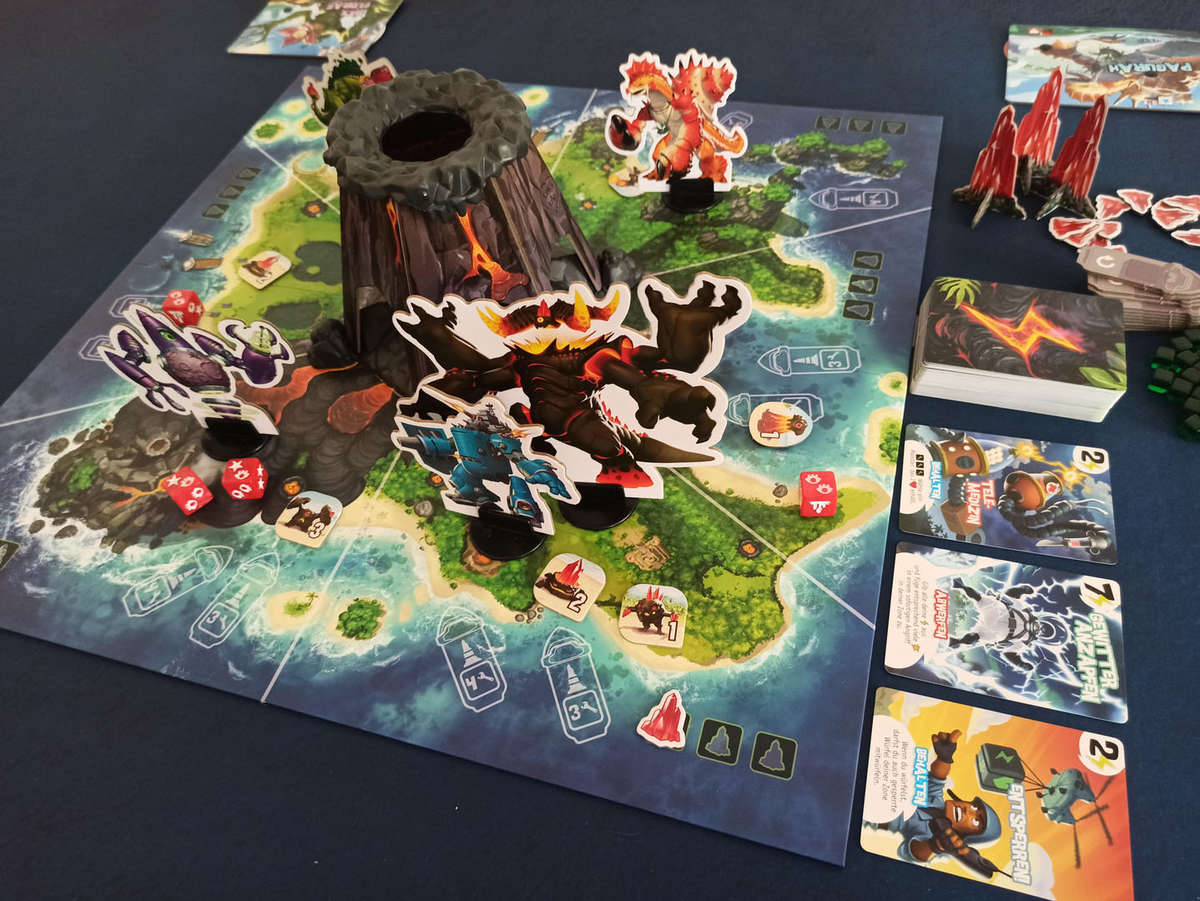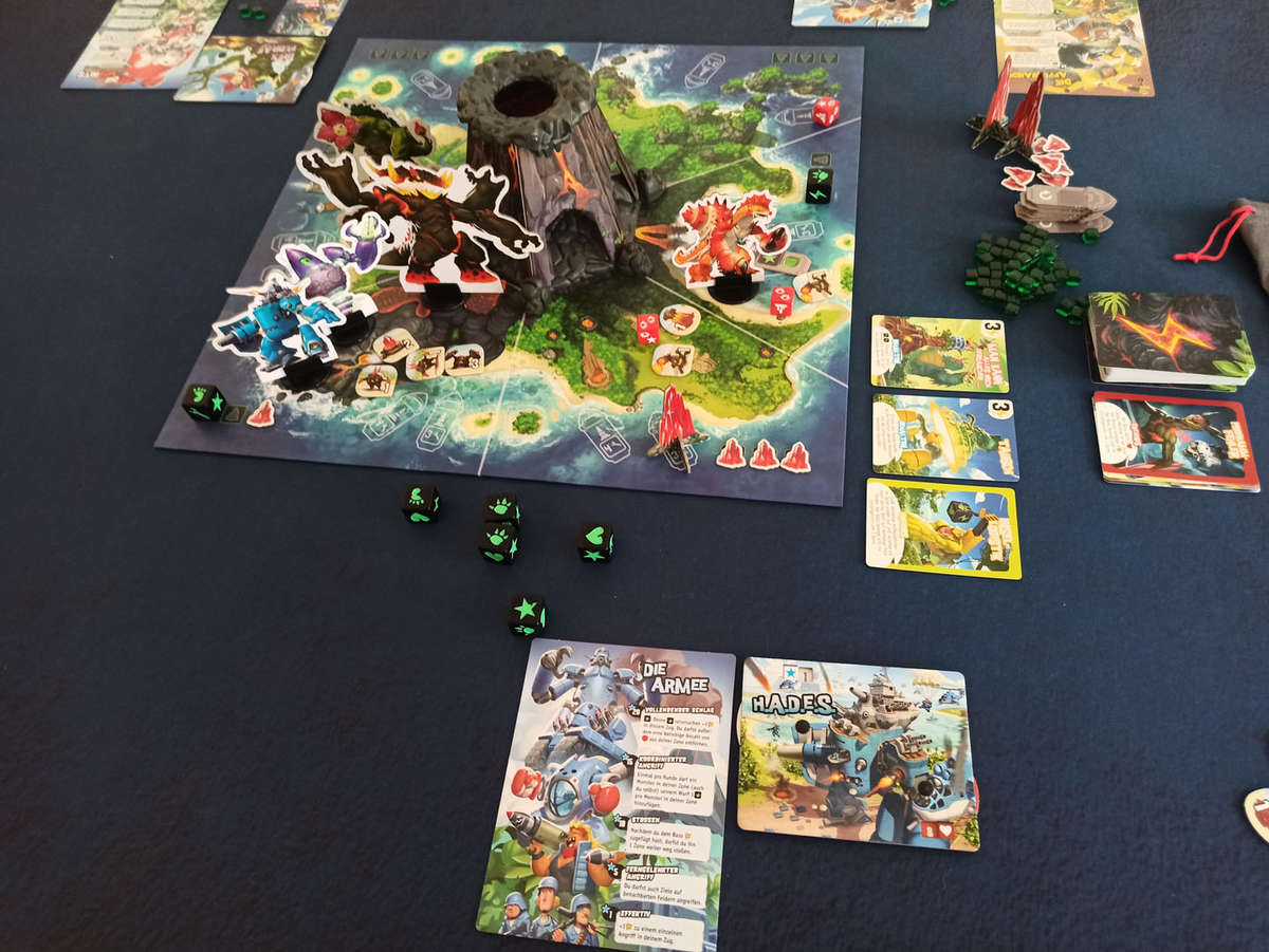 Es gibt viel Spielmaterial, Schergen, Würfel, Monster, Vulkanteile, Hilfsteile, Powerkarten, und und und. Bei so vielen Teilen auf dem Spielbrett leidet zu Beginn ein wenig die Übersicht. Der Vulkan in der Mitte tut sein Übriges dazu, da er hinter ihm liegendes Spielmaterial verdeckt, aber dafür hat das Spiel eine tolle Tischpräsenz. Der Vulkan, die großen Standees und die Würfel machen einiges her.