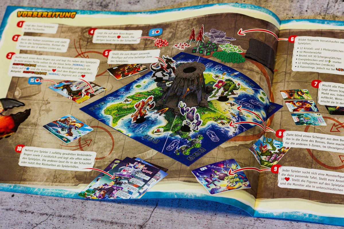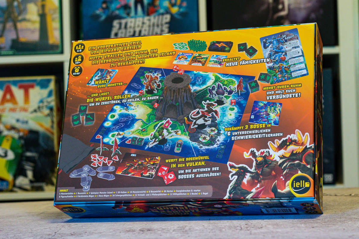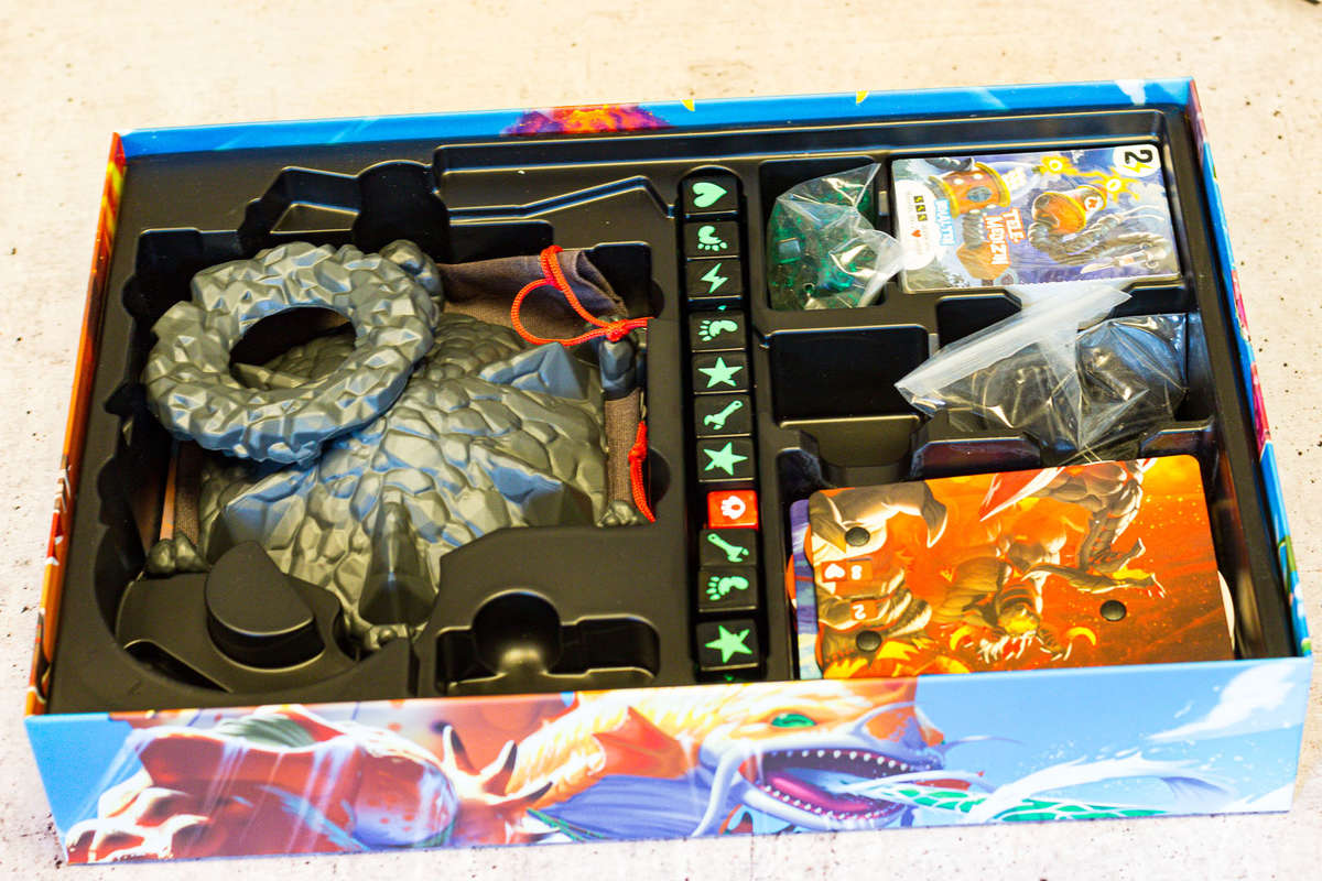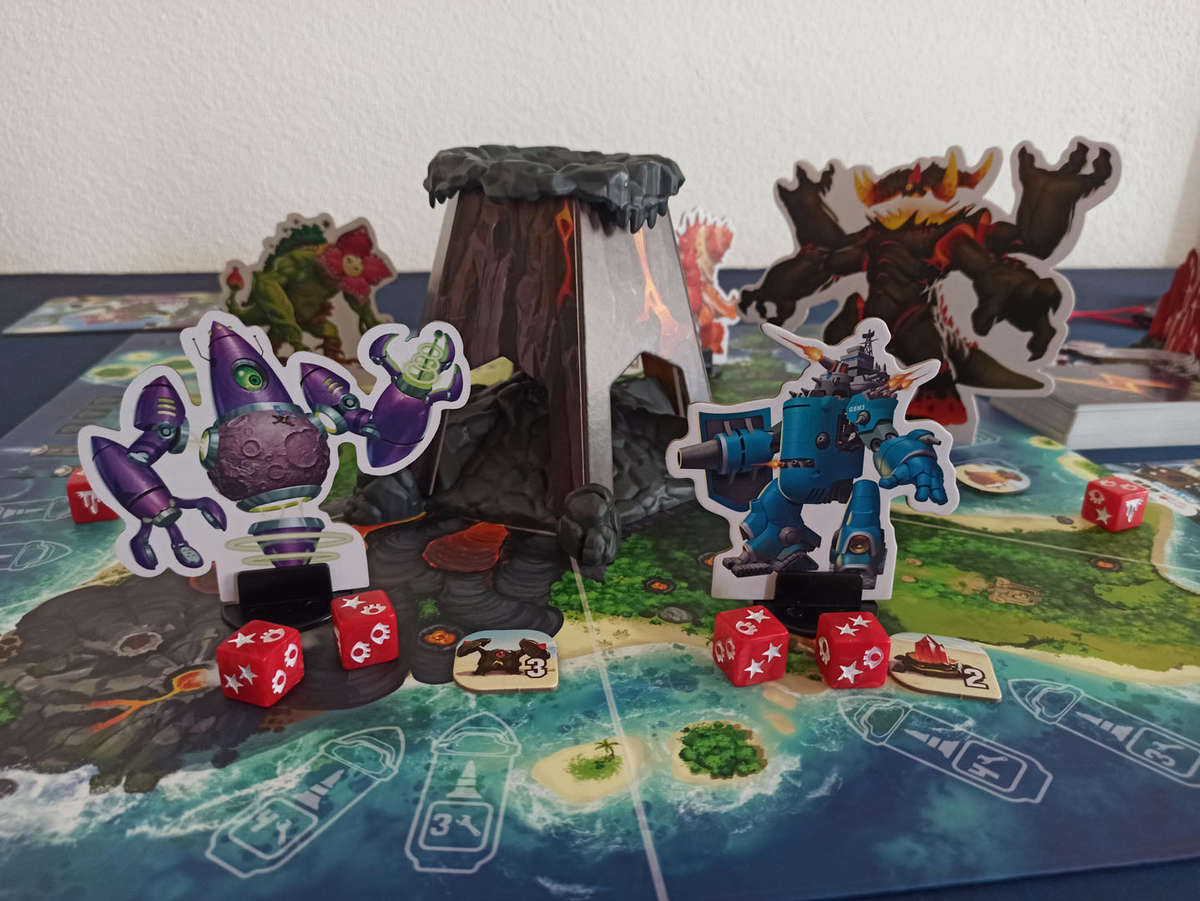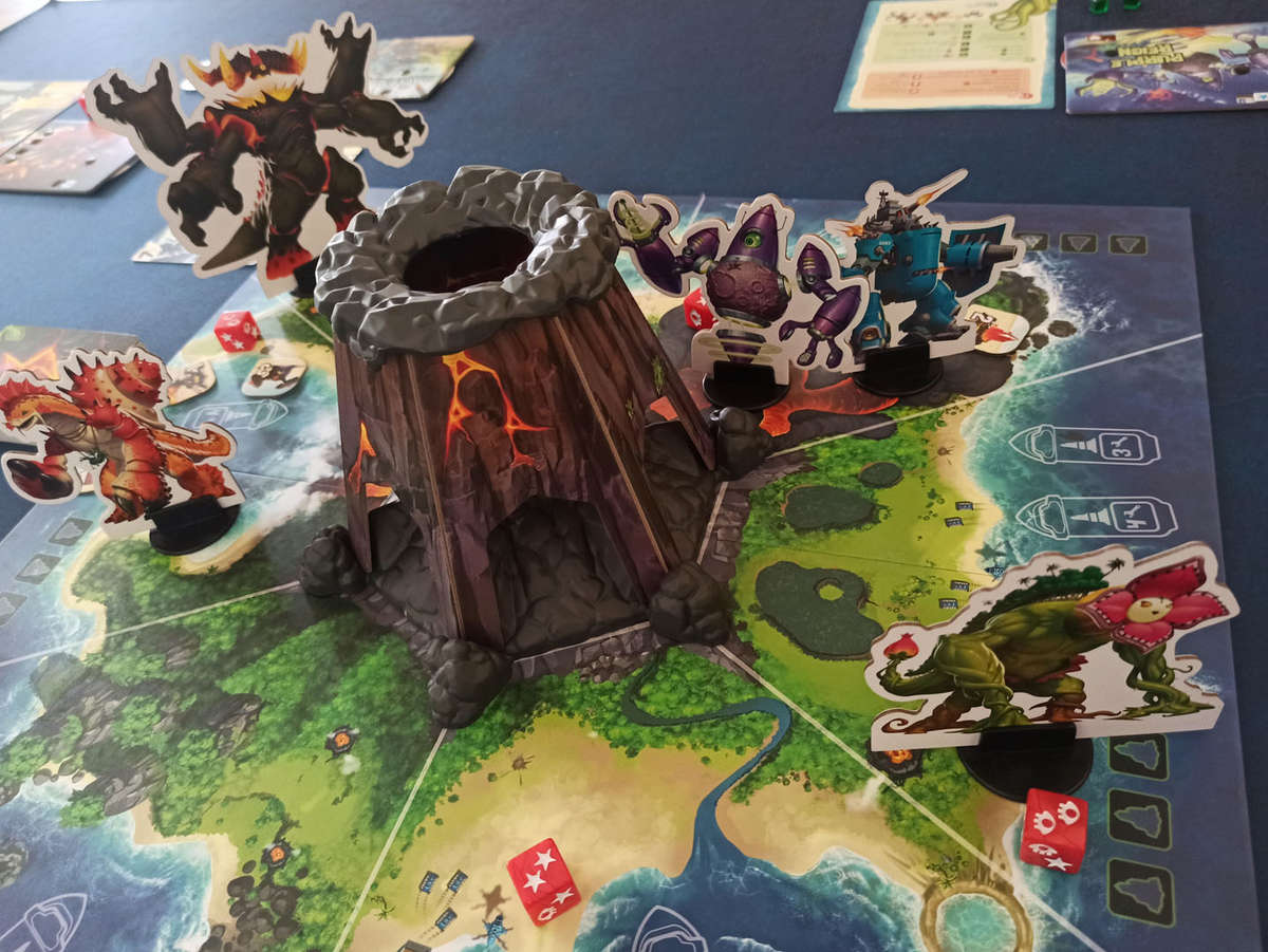 Es gibt viel Spielmaterial, Schergen, Würfel, Monster, Vulkanteile, Hilfsteile, Powerkarten, und und und. Bei so vielen Teilen auf dem Spielbrett leidet zu Beginn ein wenig die Übersicht. Der Vulkan in der Mitte tut sein Übriges dazu, da er hinter ihm liegendes Spielmaterial verdeckt, aber dafür hat das Spiel eine tolle Tischpräsenz. Der Vulkan, die großen Standees und die Würfel machen einiges her.