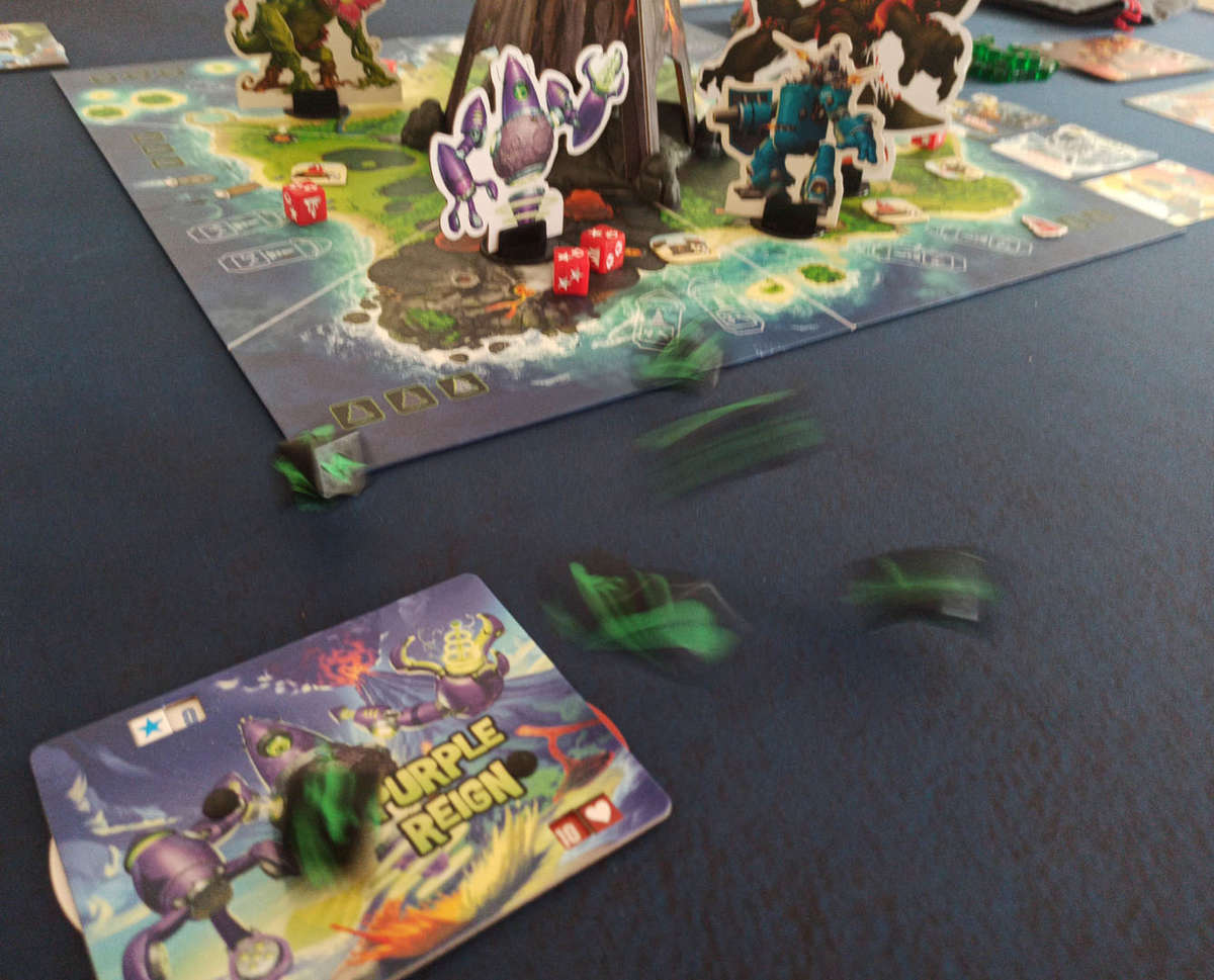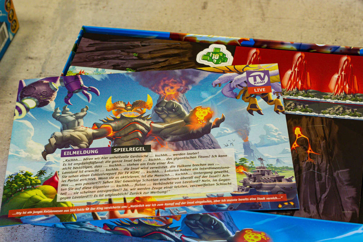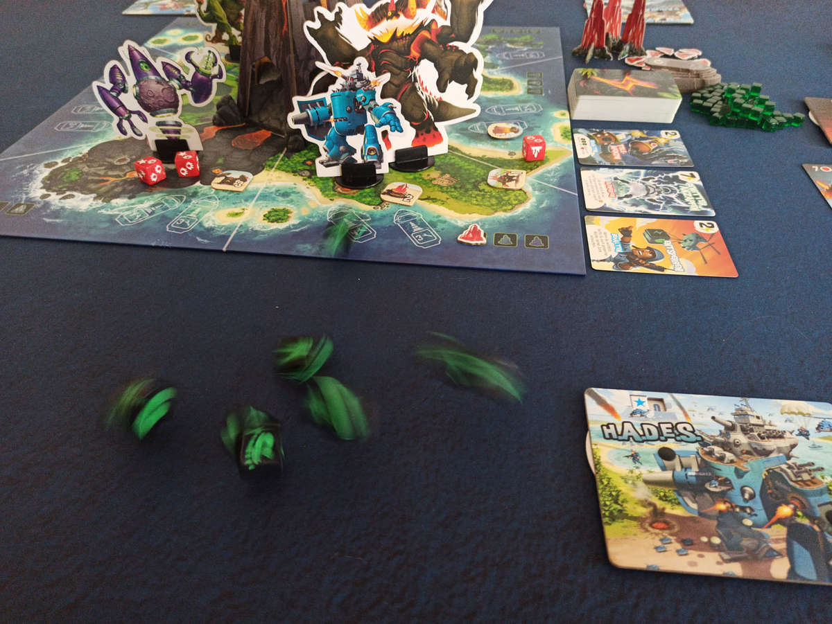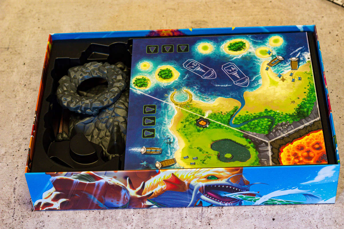 Es gibt viel Spielmaterial, Schergen, Würfel, Monster, Vulkanteile, Hilfsteile, Powerkarten, und und und. Bei so vielen Teilen auf dem Spielbrett leidet zu Beginn ein wenig die Übersicht. Der Vulkan in der Mitte tut sein Übriges dazu, da er hinter ihm liegendes Spielmaterial verdeckt, aber dafür hat das Spiel eine tolle Tischpräsenz. Der Vulkan, die großen Standees und die Würfel machen einiges her.