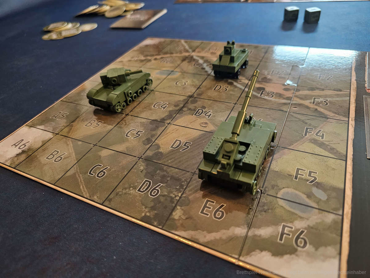 Hierfür werden Würfel und geheime Befehle genutzt, um die einzelnen Spielzüge unvorhersehbarer zu gestalten. Während in der Artillerie-Phase dank zweier Würfel und einem Koordinaten-Gitter Einschlagpunkte (und damit auch mögliche Schadenspunkte) ermittelt werden, planen die beiden Parteien geheim, wohin sie ihre Fahrzeuge bewegen wollen. Fahren sie dabei in eines der vorher festgehaltenen Einschlaglöcher erleiden sie Schaden. Fahren sie über Unterstützungskisten, können sie Handkarten ziehen, die ihnen während der Runden nützliche Effekte liefern.