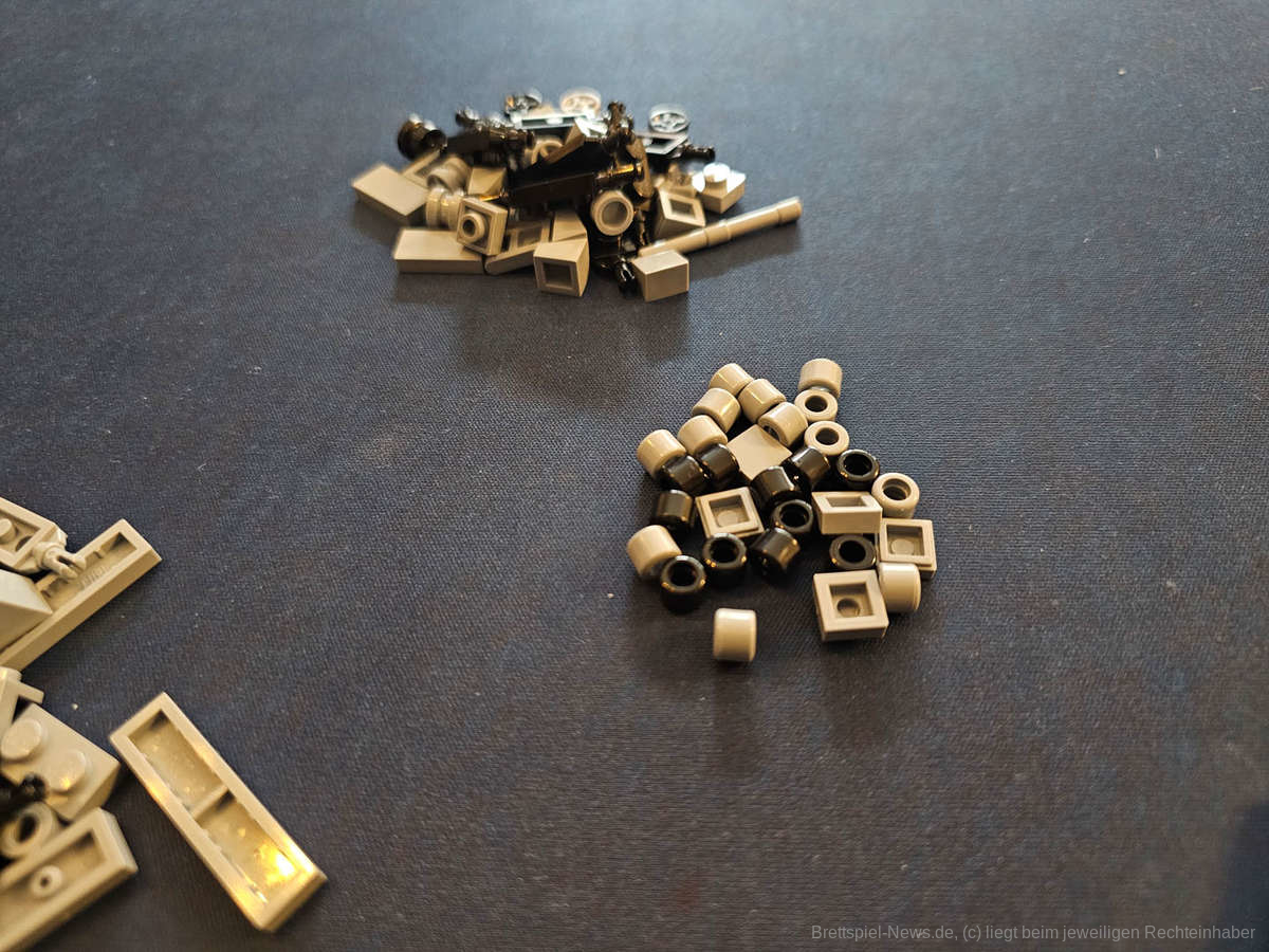 Man muss es sich schon ein wenig auf der Zunge zergehen lassen, dass beide Parteien hier mit Panzern aus Klemmbausteinen spielen, die an originale Vorbilder aus dem zweiten Weltkrieg erinnern und auch deren Namen tragen. Da das Spiel offiziell ab 8 Jahren spielbar ist, stellte ich mir ein Kind vor, das freudig mit seinem Panzerkampfwagen VI Tiger auf gegnerische Fahrzeuge schießt, während der Vater erst einmal erklärt, warum er vielleicht nicht grade die Deutschen in diesem Szenario spielen wollen würde. Ob eine solche Thematik in Brettspielen angebracht ist, sei dahingestellt und soll/kann an dieser Stelle auch gar nicht behandelt werden, da alle ihren eigenen Geschmack von Unterhaltung haben. Gleichzeitig ist „Small Army Tank Wars“ durch sein äußeres Erscheinungsbild, die Klemmbausteine und das Spielsystem zum Teil sehr auf Kinder angesetzt, was bei mir einen mehr als faden Beigeschmack hinterlässt. Dass der Slogan des Spiels „Wollen Sie spielen? Bauen Sie zuerst ihren eigenen Panzer!“ ist, macht die ganze Sache nicht eleganter.
