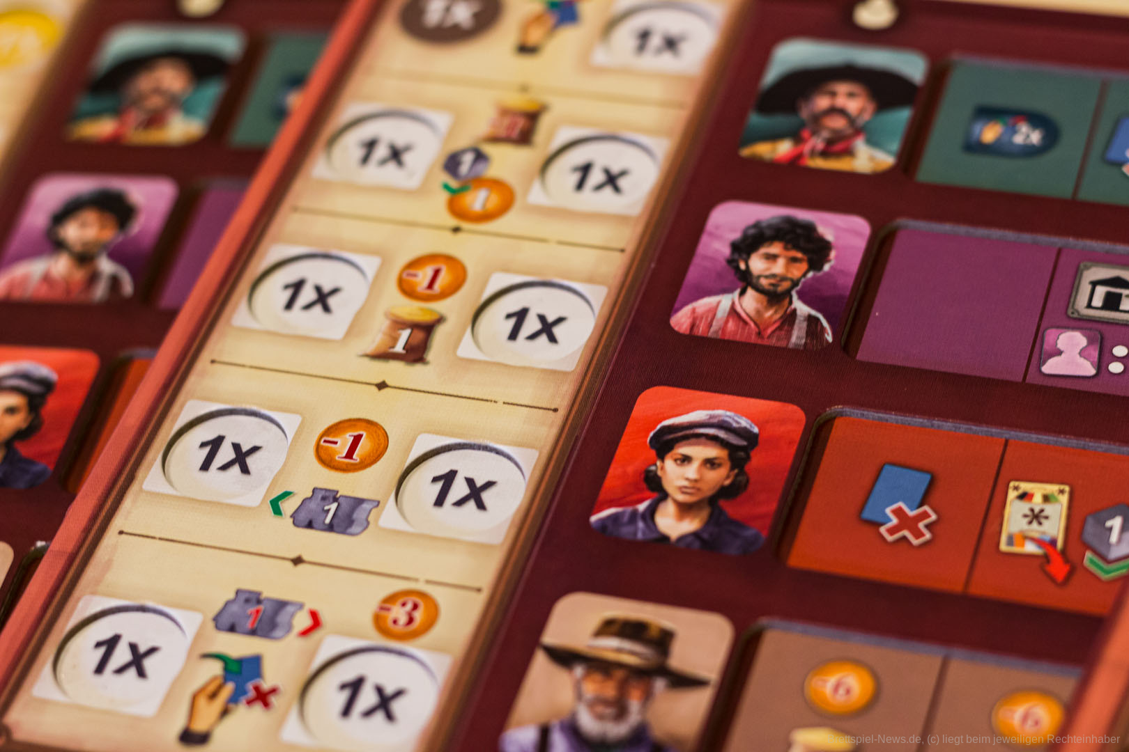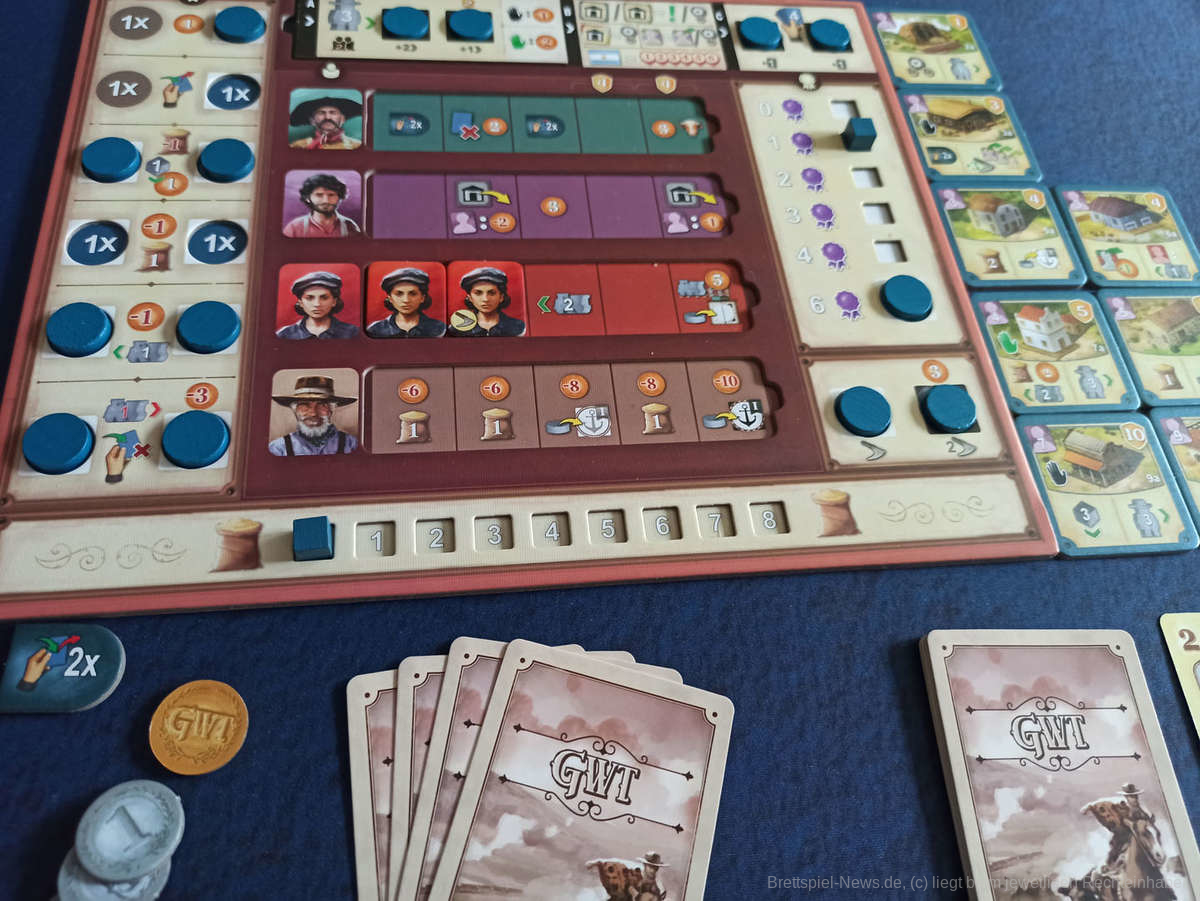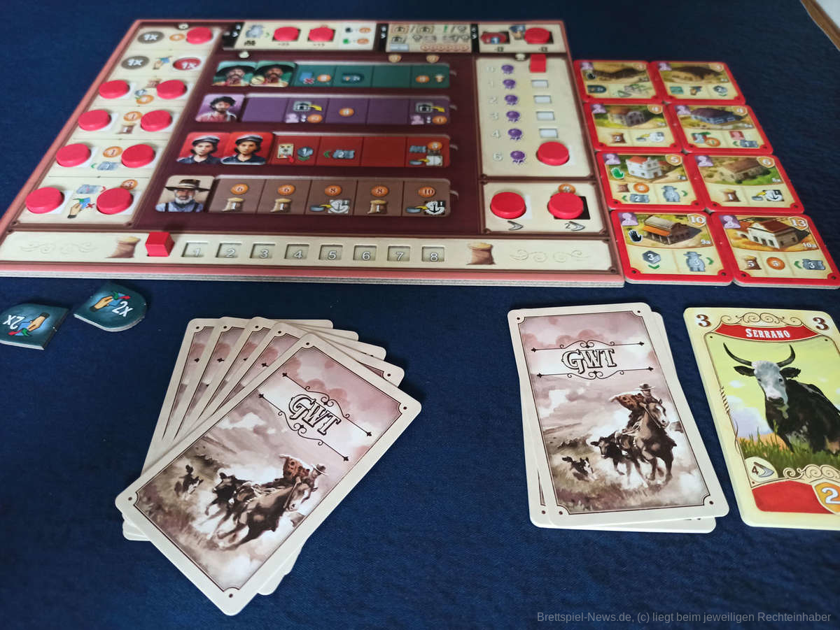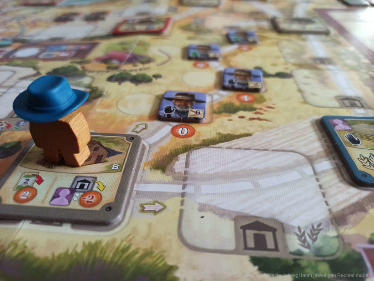 Gut gefallen hat uns die Anpassung durch die Granjeros. Diese ersetzen die Hindernisse des Grundspiels und können nun nicht mehr einfach durch Zahlung von Geld genommen, sondern müssen unterstützt werden. Hierfür ist ein bestimmter Grad an Macht nötig, die im Laufe des Spiels durch die Wahl der freigeschalteten Aktionsplättchen, Arbeiter, etc. aufgebaut wird, notfalls durch die Aufnahme von Erschöpfungskarten, die das Deck verstopfen. Es gibt Felder, die das Unterstützen von drei Granjeros auf beliebigen Plätzen auf einmal erlaubt, wodurch dies nun durchaus eine mächtige Aktion werden kann. Insgesamt ist es nun wesentlich thematischer und strategischer gestaltet. Zuvor war diese Aktion doch eher wenig spektakulär.