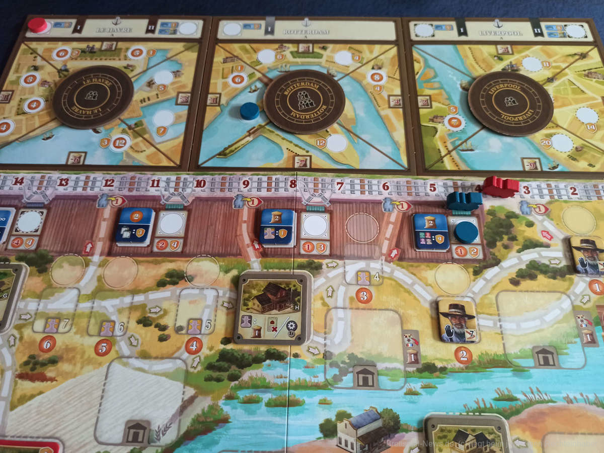 2. Arbeiter, die auf dem Arbeitsmarkt-Bereich Zeile für Zeile von oben beginnend einsortiert werden. Die Zeilen legen den Preis bei der Aktion „Anstellen“ fest. Beim Zeilenwechsel werden teils Ankersymbole überschritten, wodurch die, zu diesem Symbol, passenden Schiffe ablegen und zu der entsprechenden Stadt segeln, um dort die zuvor auf dem Schiff platzierten Spielmarker abzulegen. Die leeren Plätze am Dock werden mit neuen Schiffsplättchen aufgefüllt.