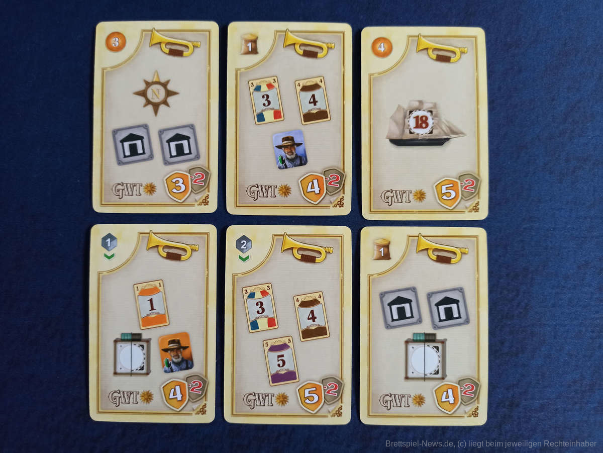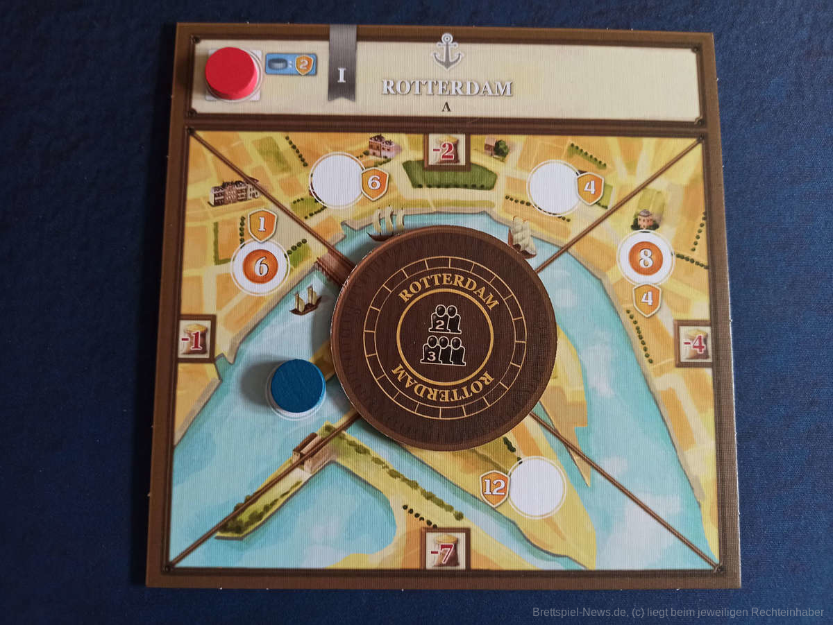 Negativ ist uns hier die Farbgebung aufgefallen. Zu welcher Stadt die Schiffe ablegen, ist durch unterschiedliche, aber leider ähnliche Farben auf winzigen Ankersymbolen gekennzeichnet. Diese auseinander zu halten ist wirklich schwierig. Auch insgesamt wirkt das Spielbrett durch viele ähnliche Farben etwas unübersichtlich.
