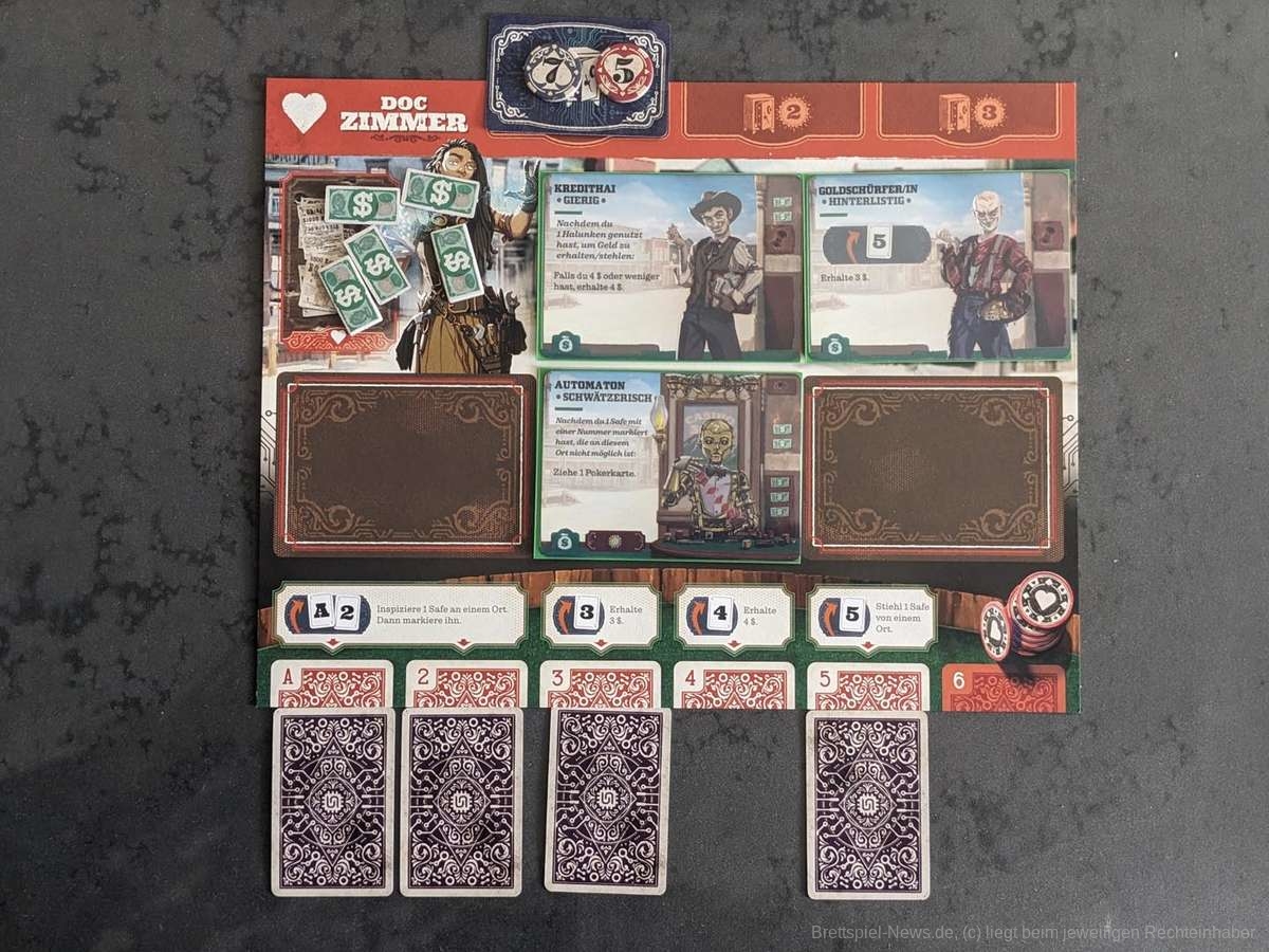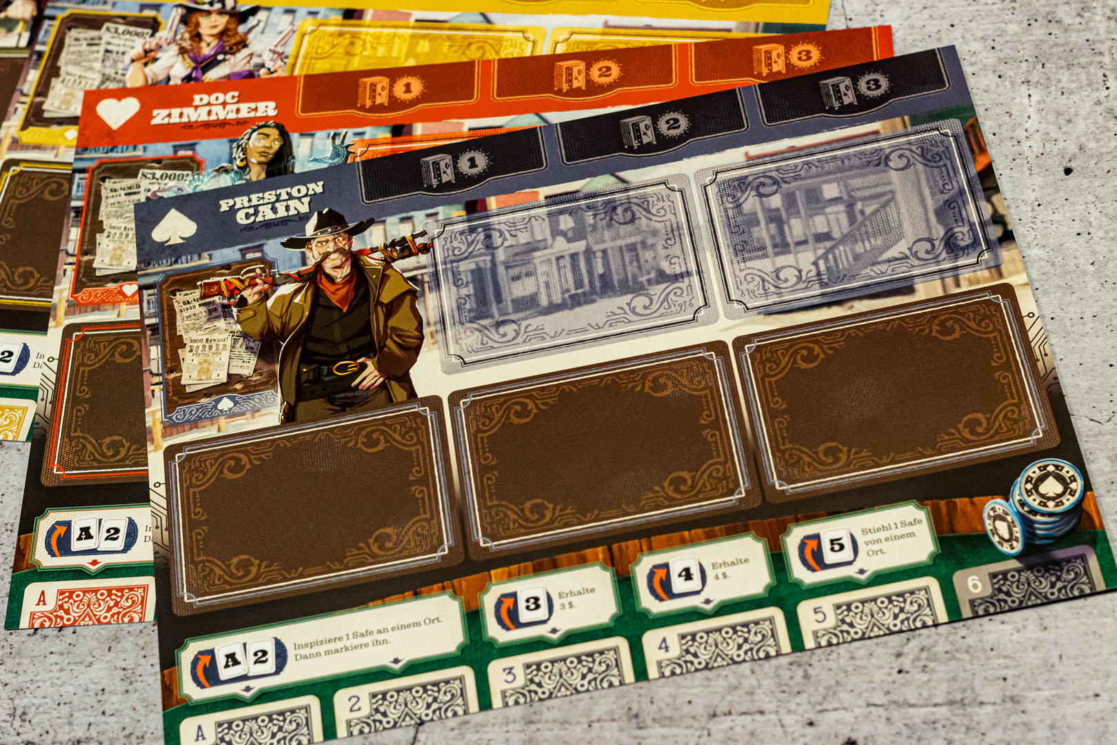„3000 Halunken“ wird normalerweise über zwei Runden gespielt. Zwei Runden reichen jedoch nicht aus, um in dem ganzen zufallsgetriebenen Geschehen eine Strategie zu entwickeln oder mit den eigenen Halunken eine Engine aufzubauen. Jeder Halunke kann meist nur ein oder zweimal in einer gesamten Partie genutzt werden, da in jeder Runde jeder Kartenslot nur einmal genutzt werden kann. Auch das Erkennen von einem Bluff ist deutlich schwieriger und ohne zu raten und einen Zufallstreffer zu landen kaum möglich. Das Spiel bietet noch einen erweiterten Modus, in dem das Spiel über drei Runden gespielt wird. Zwar ist es hierbei eher möglich eine Strategie zu verfolgen, da die Aktionsmöglichkeiten jedoch nicht allzu groß sind, haben wir drei Runden für diese Art von Spiel wiederum als zu lang empfunden. Das Inspizieren und Stehlen von Safes ist ebenfalls ein Punkt, bei dem uns das Glück holt sein muss. Wenn ich Pech habe, habe ich bis zum Spielende keinen Safe mit einer hohen Punktezahl inspiziert und kann nur auf gut Glück Safes aus der Auslage stehlen und auf das Beste hoffen.