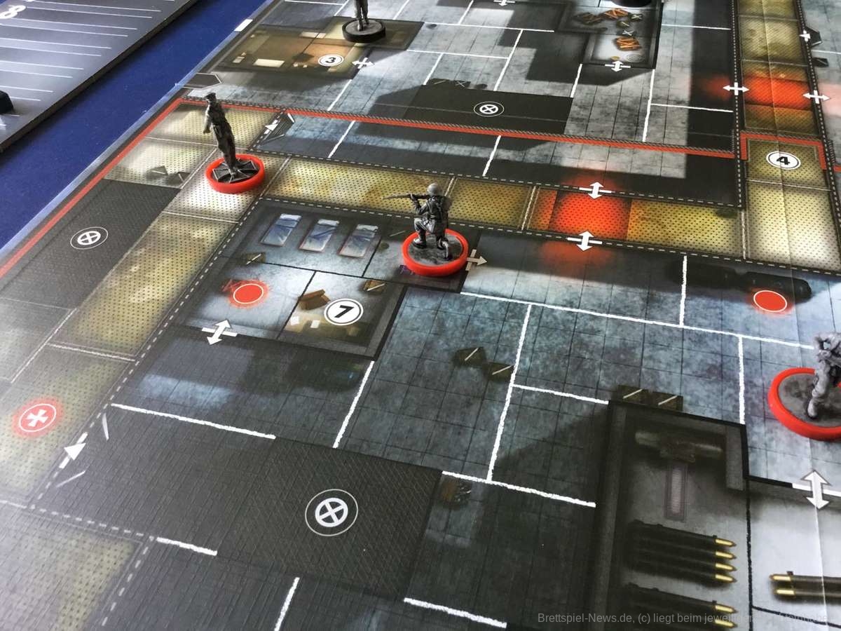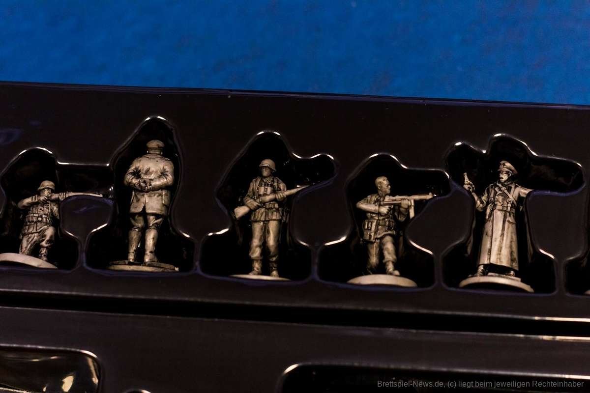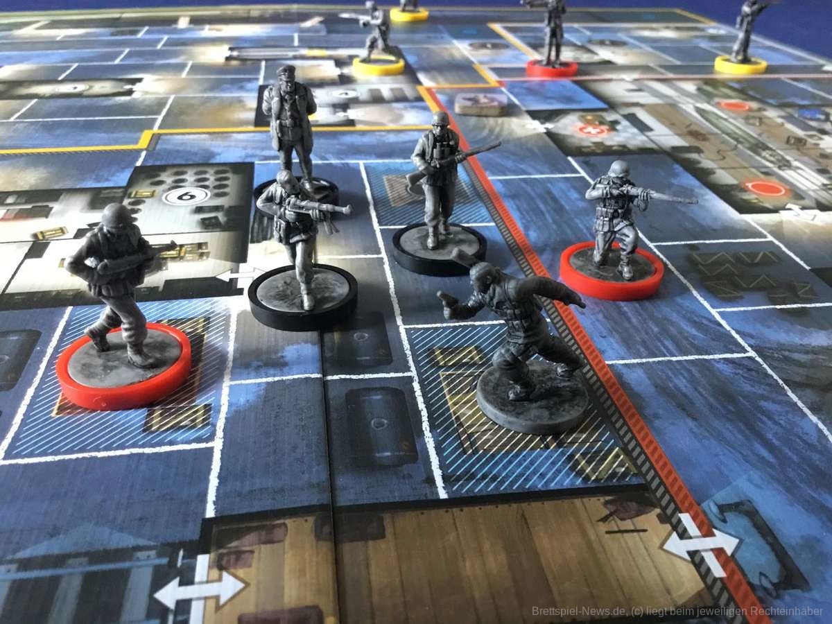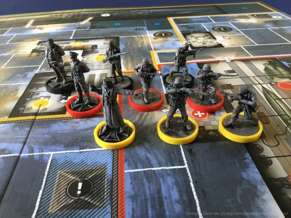 Der Videospielvorlage entsprechend, spielt die Verteidigerseite Wehrmachtssoldaten. Das stößt manchen sauer auf und sorgt sicher gerade im deutschen Raum für ein verständliches Unwohlsein. Nicht selten tauchte direkt zu Beginn die Frage auf, ob man freiwillig verlieren könne. Abgesehen von dieser Einstiegshürde ist „Sniper Elite - The Board Game“ für die Verteidiger allerdings genauso spannend wie für den Scharfschützen. Zu Spielbeginn stehen die Verteidiger ahnungslos da. Auch die kleinste Information ist unglaublich wertvoll. Der Schütze ist zwar immer einen Zug voraus, dafür sind die Verteidiger aber in der Überzahl und ihre Offiziere verfügen über starke Spezialfähigkeiten. Durch geschickte Positionierung lässt sich so schnell ein relativ dichtes Fahndungsnetz aufspannen, das dem Schleicher die Wege verbaut. Natürlich könnte er sich an den Posten vorbei schleichen, doch das kostet wertvolle Zeit.