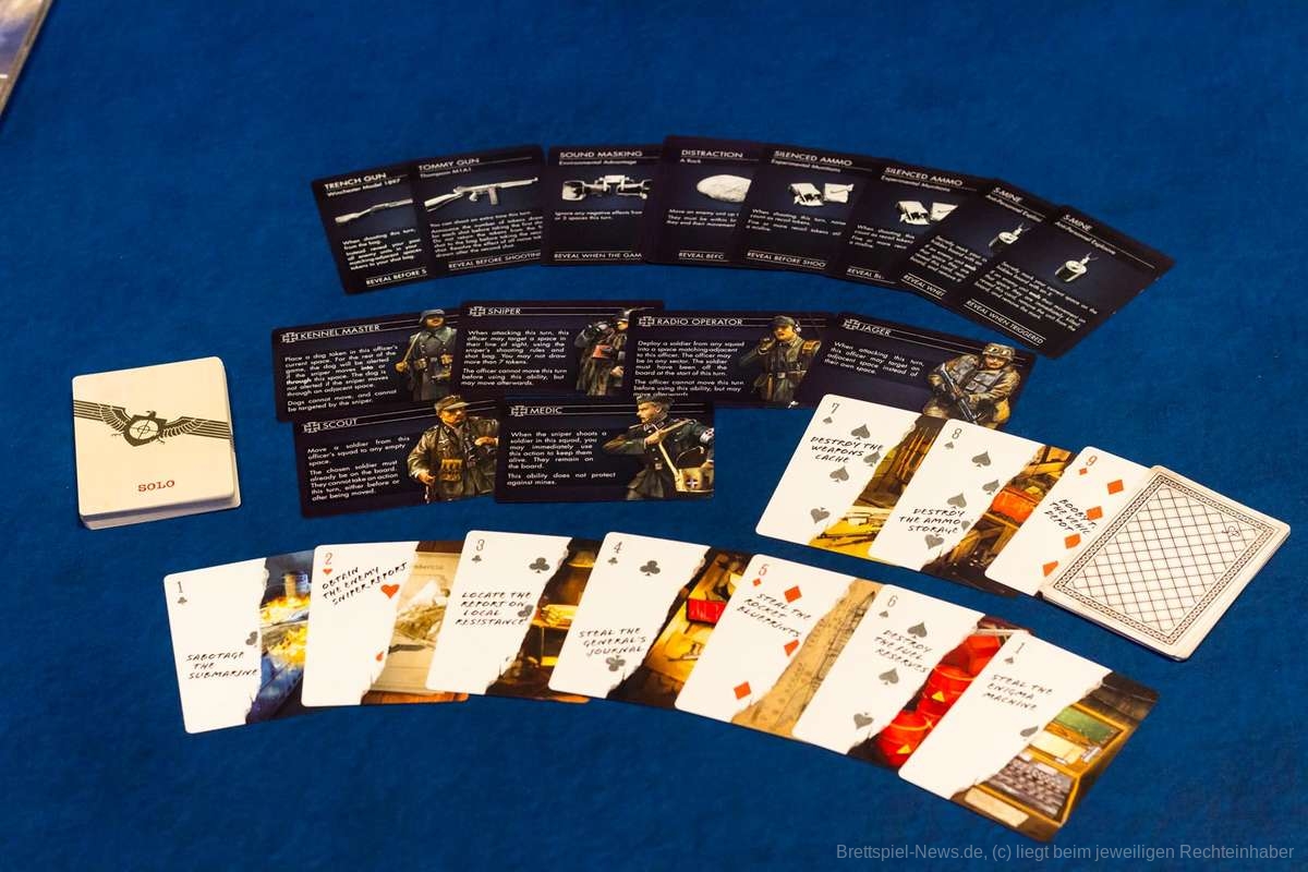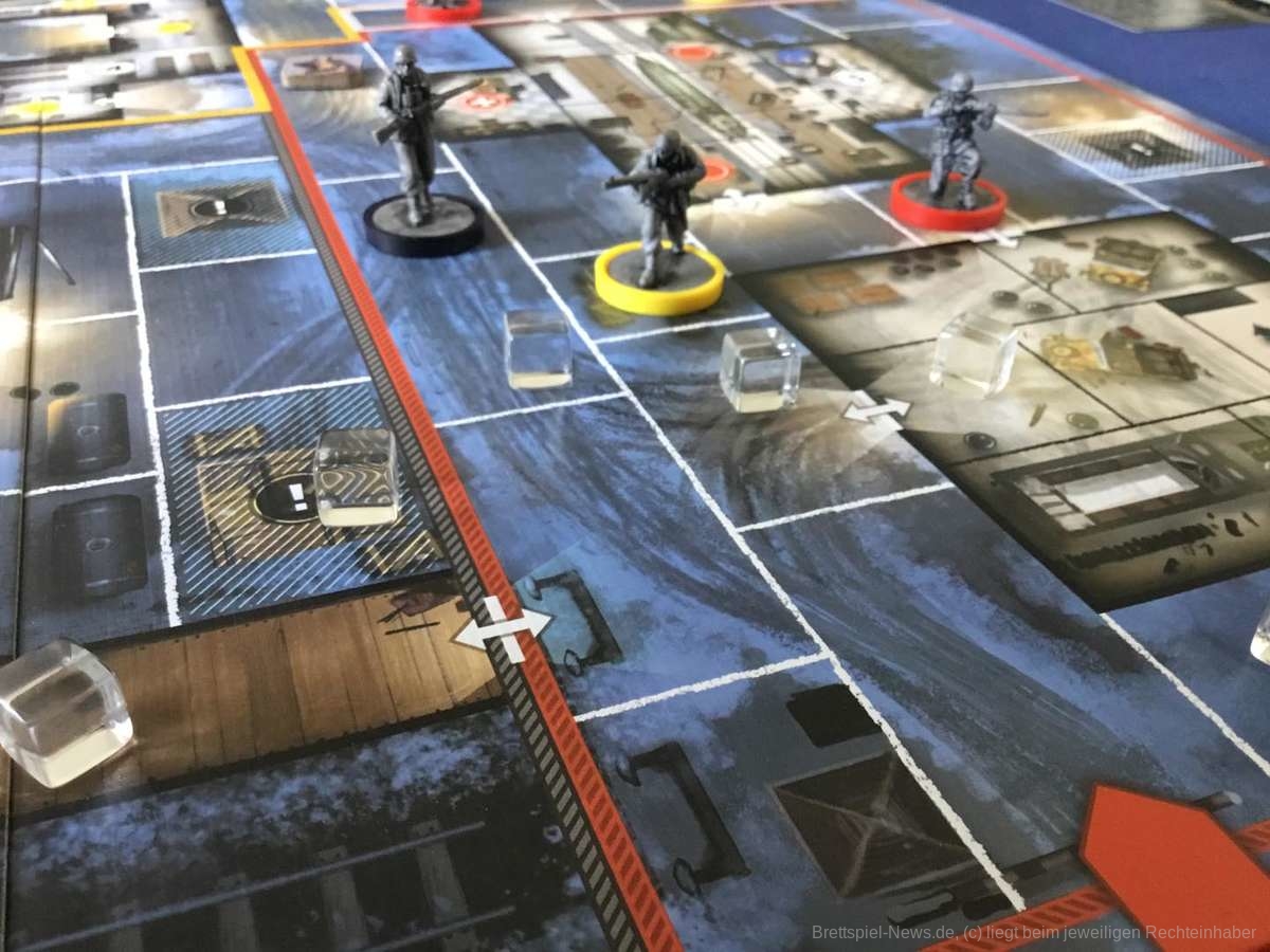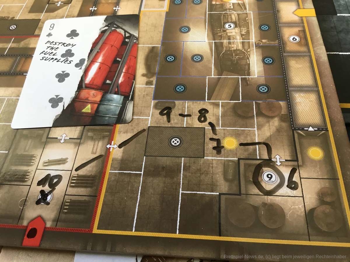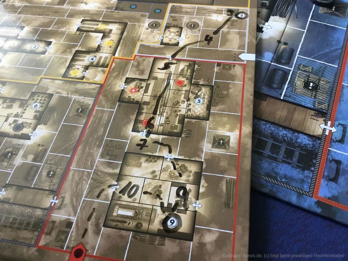 Der Videospielvorlage entsprechend, spielt die Verteidigerseite Wehrmachtssoldaten. Das stößt manchen sauer auf und sorgt sicher gerade im deutschen Raum für ein verständliches Unwohlsein. Nicht selten tauchte direkt zu Beginn die Frage auf, ob man freiwillig verlieren könne. Abgesehen von dieser Einstiegshürde ist „Sniper Elite - The Board Game“ für die Verteidiger allerdings genauso spannend wie für den Scharfschützen. Zu Spielbeginn stehen die Verteidiger ahnungslos da. Auch die kleinste Information ist unglaublich wertvoll. Der Schütze ist zwar immer einen Zug voraus, dafür sind die Verteidiger aber in der Überzahl und ihre Offiziere verfügen über starke Spezialfähigkeiten. Durch geschickte Positionierung lässt sich so schnell ein relativ dichtes Fahndungsnetz aufspannen, das dem Schleicher die Wege verbaut. Natürlich könnte er sich an den Posten vorbei schleichen, doch das kostet wertvolle Zeit.