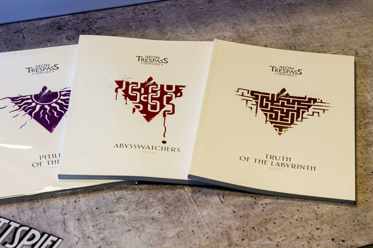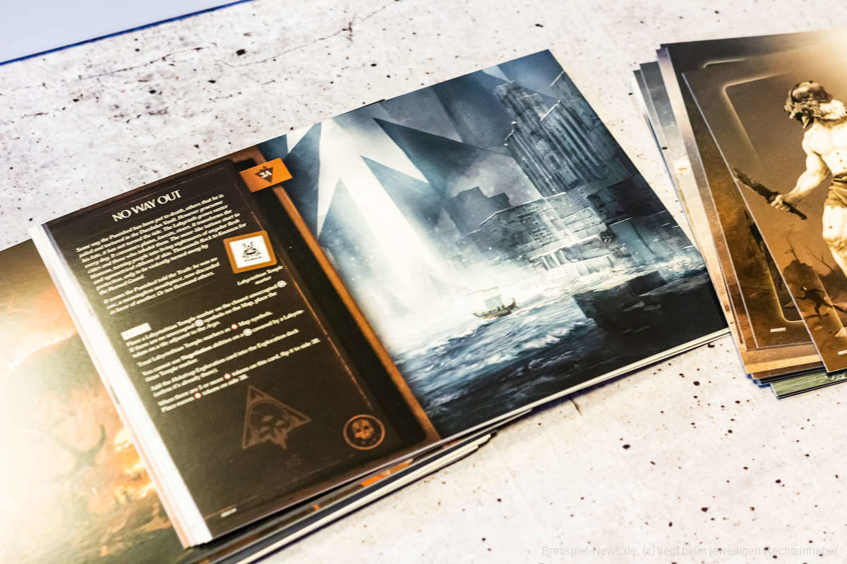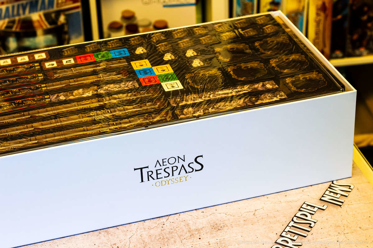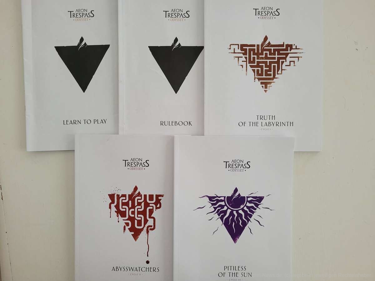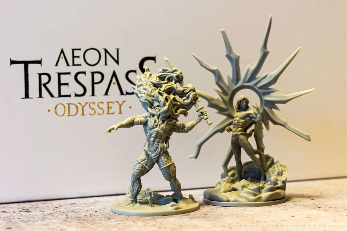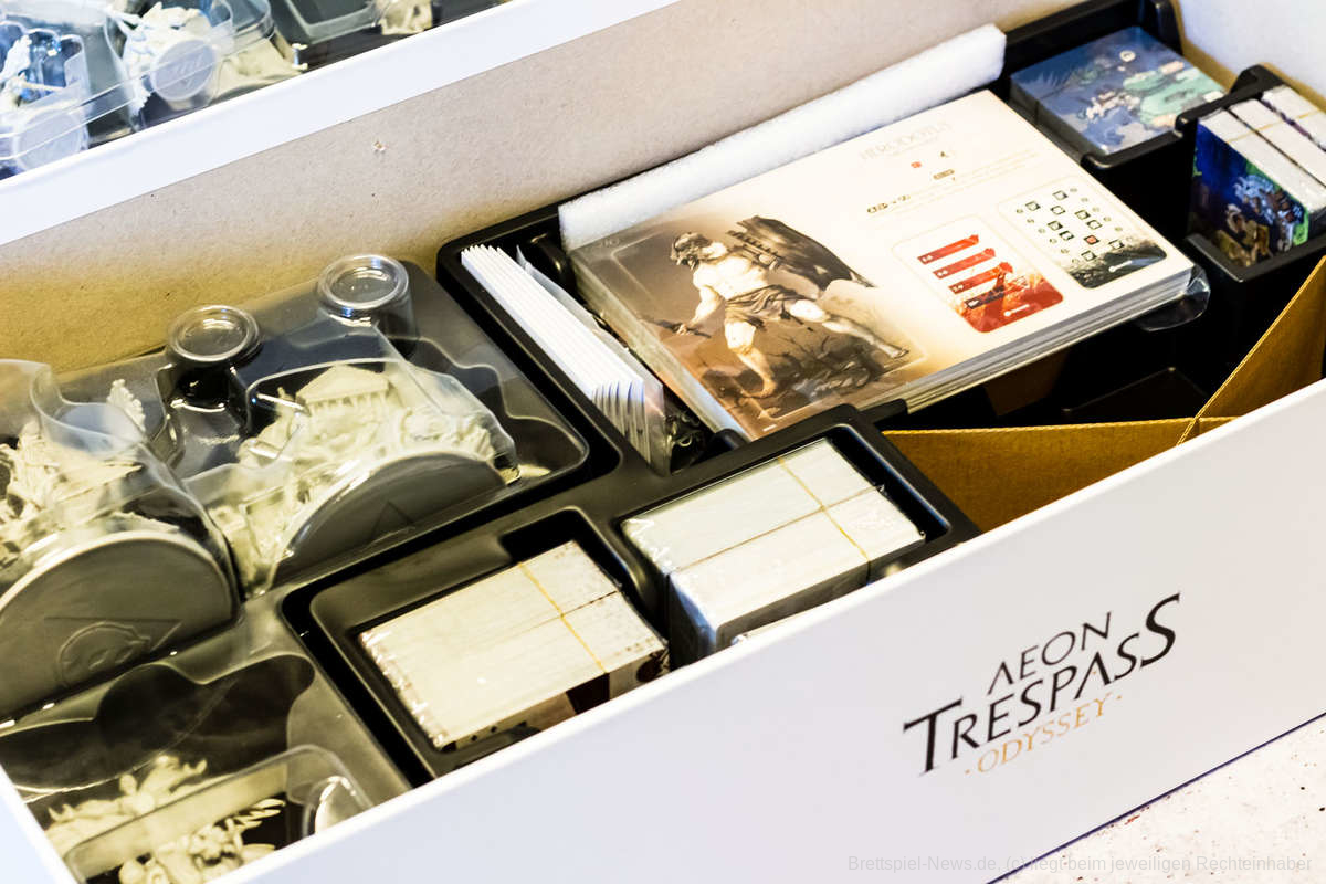 Was direkt beim Öffnen des Kartons klar wird ist, dass „Aeon Trespass: Odyssey“ von oben bis unten vollgestopft ist mit Material. Es sind unzählige Karten, etliche Miniaturen, ein großes Spielbrett, Terrainteile, Würfel, Token und drei Kampagnenbücher, ein Regelbuch und ein Learn-to-Play-Heft vorhanden. Das Material ist qualitativ sehr hochwertig. Die Miniaturen sind wundervoll modelliert, das Artwork liebevoll gestaltet und das restliche Material aus dicker Pappe gefertigt. Lediglich die Würfel könnten etwas schwerer in der Hand liegen. Mein größter Kritikpunkt, was das Material betrifft ist, dass kein adäquates Inlay vorhanden ist. Gerade ein so opulent gestaltetes Spiel sollte schnell auf- und abgebaut werden können. Ansonsten besteht ein ähnliches Problem, wie wir es bei „Gloomhaven“ bereits gesehen haben.