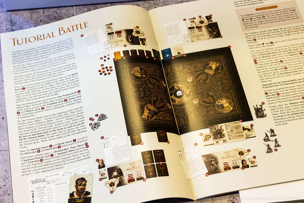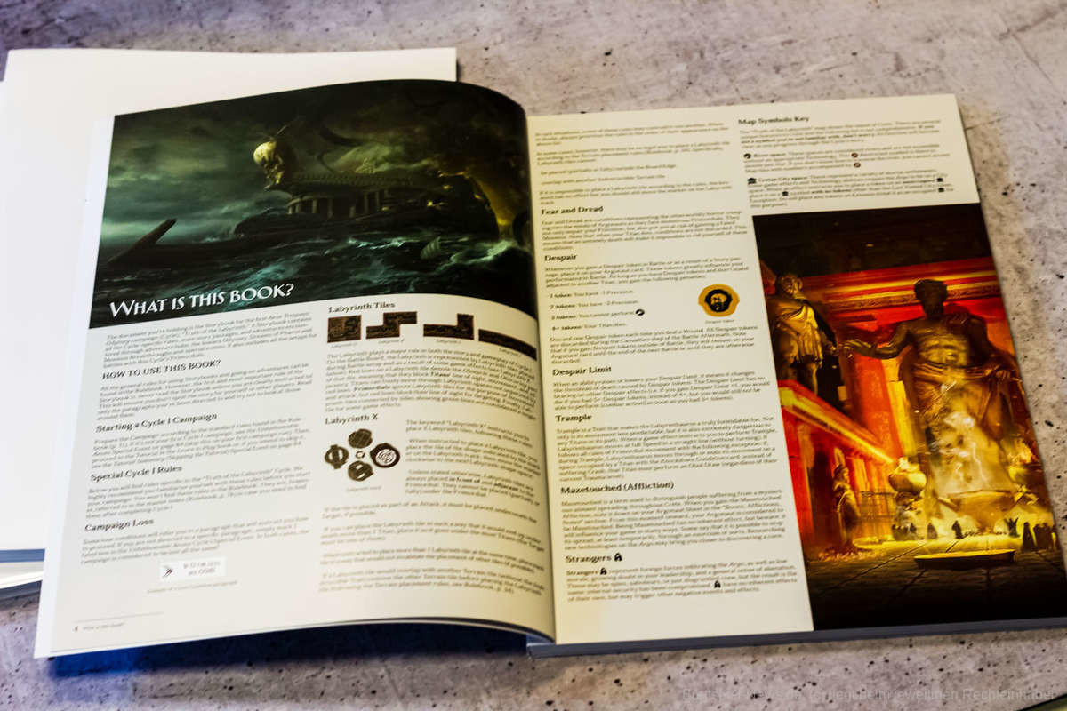 Mein größter Kritikpunkt ist, dass die Regeln teilweise sehr kleinteilig sind. Nicht umsonst kommt das Spiel derzeit auf eine Komplexität von 4,74 von 5 Punkten auf Boardgamegeek.com. Allerdings ist eher die Masse an Regeln ein Problem, da die Grundprinzipien sehr verständlich sind. Trotzdem ist es eine harte Aufgabe, sich durch das Regelbuch zu kämpfen. Es besteht eine sehr gute Learn-to-Play Anleitung in der viele Mechaniken des Spiels aufgezeigt werden, allerdings muss im Laufe der Kampagne immer wieder in das Hauptregelwerk geschaut werden. Dazu kann ich nur sagen, dass aller Anfang schwer ist. Je mehr gespielt wird und umso mehr sich die Spieler und Spielerinnen auf das Spiel einlassen, desto leichter gehen die Regeln von der Hand. Wenn ihr einige Regeln und Besonderheiten in den ersten Runden überseht, ist das ganz normal. Hauptsache ist doch, dass wir Spaß haben und die Regelfeinheiten kommen von ganz alleine. Trotzdem hätte ich mir Spielerhilfen gewünscht.