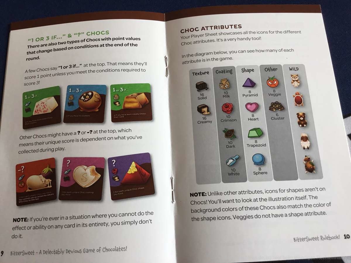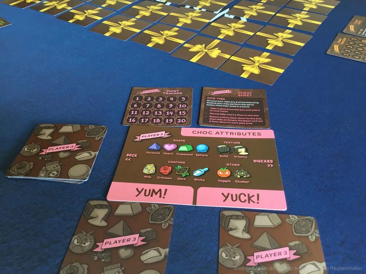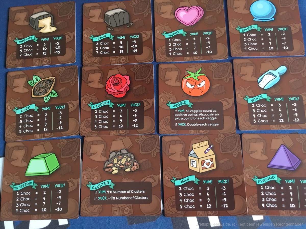 Soweit - so einfach. Allerdings haben die Pralinen Fähigkeiten, die entweder beim Aufdecken oder beim verdeckten Ziehen zum Tragen kommen. Das sorgt für einige Überraschungen und das Gemüse im Schokomantel zählt dabei nicht zu den angenehmen.