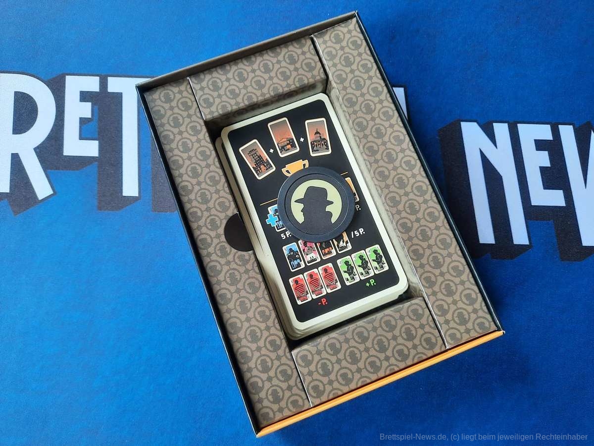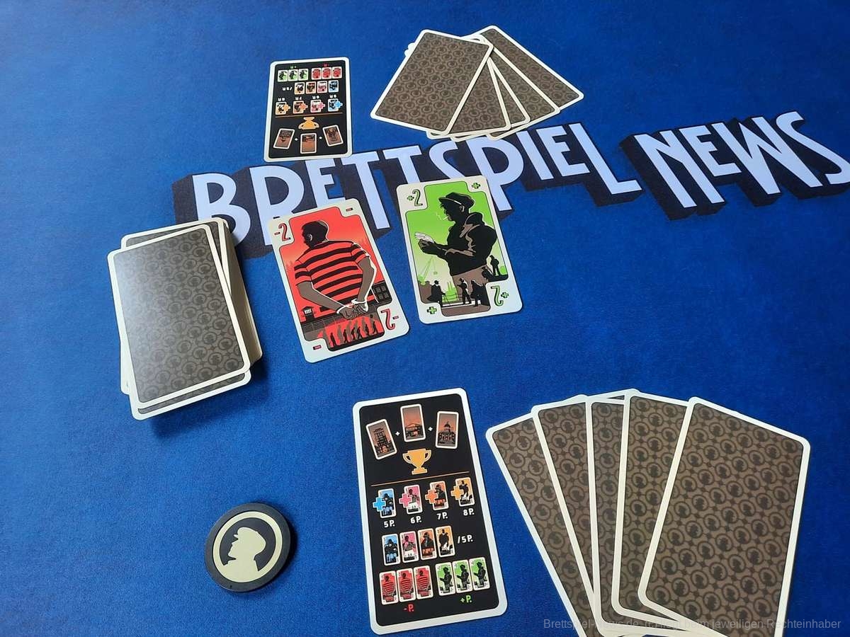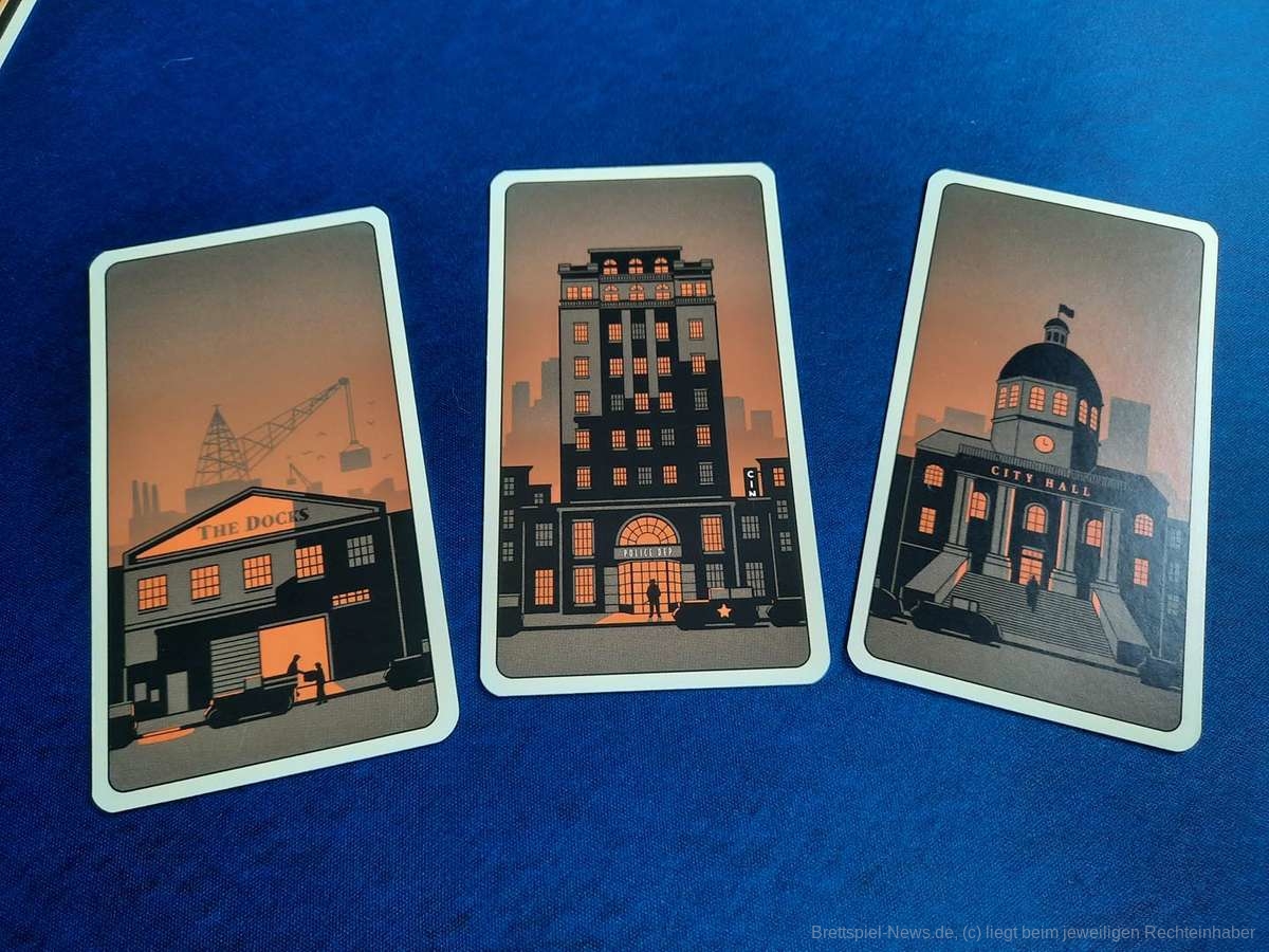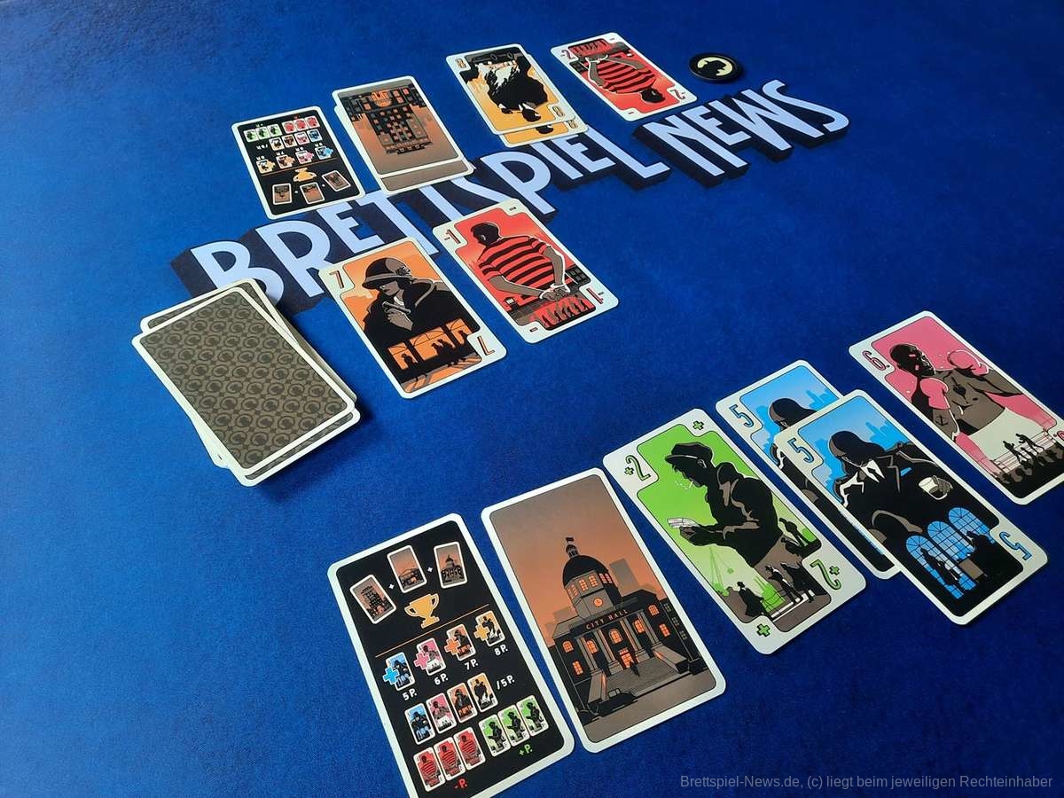 Die Karten teilen sich in Bandenkarten mit den Werten 5,6,7 und 8 auf. Jede Bandenkarte ist ihrem Wert entsprechend oft im Stapel, d.h. eine Fünf ist fünfmal im Stapel usw. Wer am Ende des Spiels die meisten Karten eines Wertes vor sich ausliegen hat, bekommt entsprechend viele Punkte. Habe ich zum Spielende zum Beispiel mehr Achten als die Gegenseite bekomme ich dafür acht Punkte. Zusätzlich bietet das Spiel noch Bündnis- und Verrat-Karten, welche Plus- oder Minuspunkte einbringen, sowie drei Gebäudekarten. Wer im Laufe des Spiels alle drei Gebäudekarten hat, gewinnt sofort und es werden keine Punkte mehr gezählt.