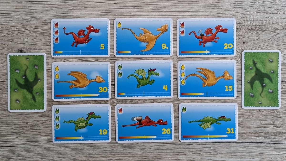 Auf den Drachenkarten sind Geschwindigkeiten von 1 bis 36, sowie eine bildliche Darstellung hiervon in Form einer dünnen Leiste zu sehen. Außerdem sind ein bis drei Flammen aufgedruckt. Die Drachen selbst liegen in den Farben rot, gelb und grün vor.