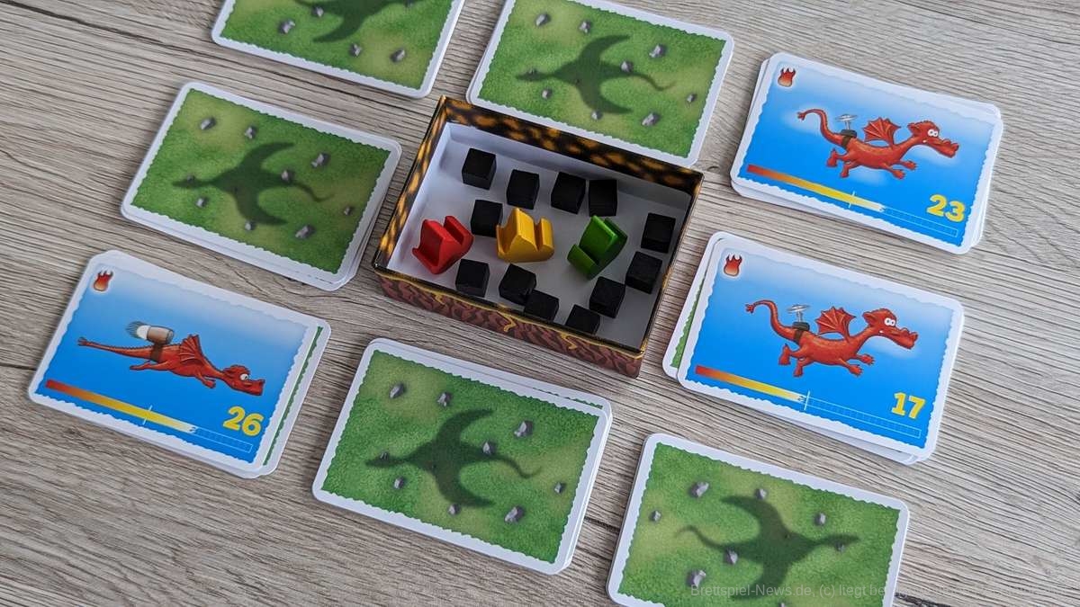 Die Drachenkarten werden in acht möglichst gleich großen Stapeln verdeckt um den Vulkan ausgelegt. Die Lavasteine und Vulkanflammen werden im Vulkan (dem Schachtelboden) bereitgelegt.