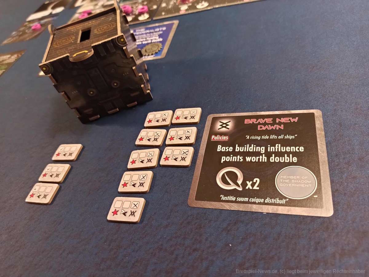Spielerisch haben wir eine interessante Mischung aus Bag Building, Area Control, Worker Placement mit Ressourcen-Management und Legacy-Elementen. Permanente Veränderungen am Spiel erfolgen eher weniger. Es werden Gebiete benannt und es darf zwischen Optionen entschieden werden. Mit neuen Missionen und erreichten Fortschritten dürfen immer wieder Umschläge und Boxen geöffnet werden, die das Spiel mit neuen Modulen und Möglichkeiten ergänzen.