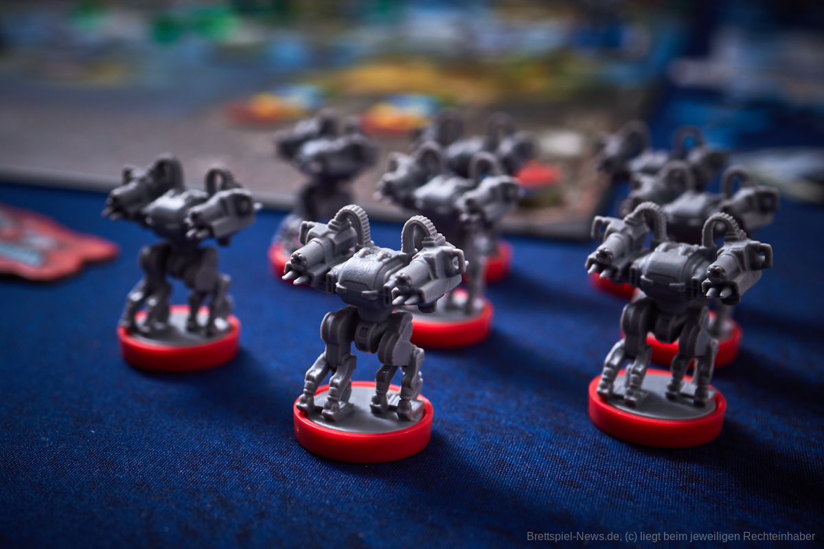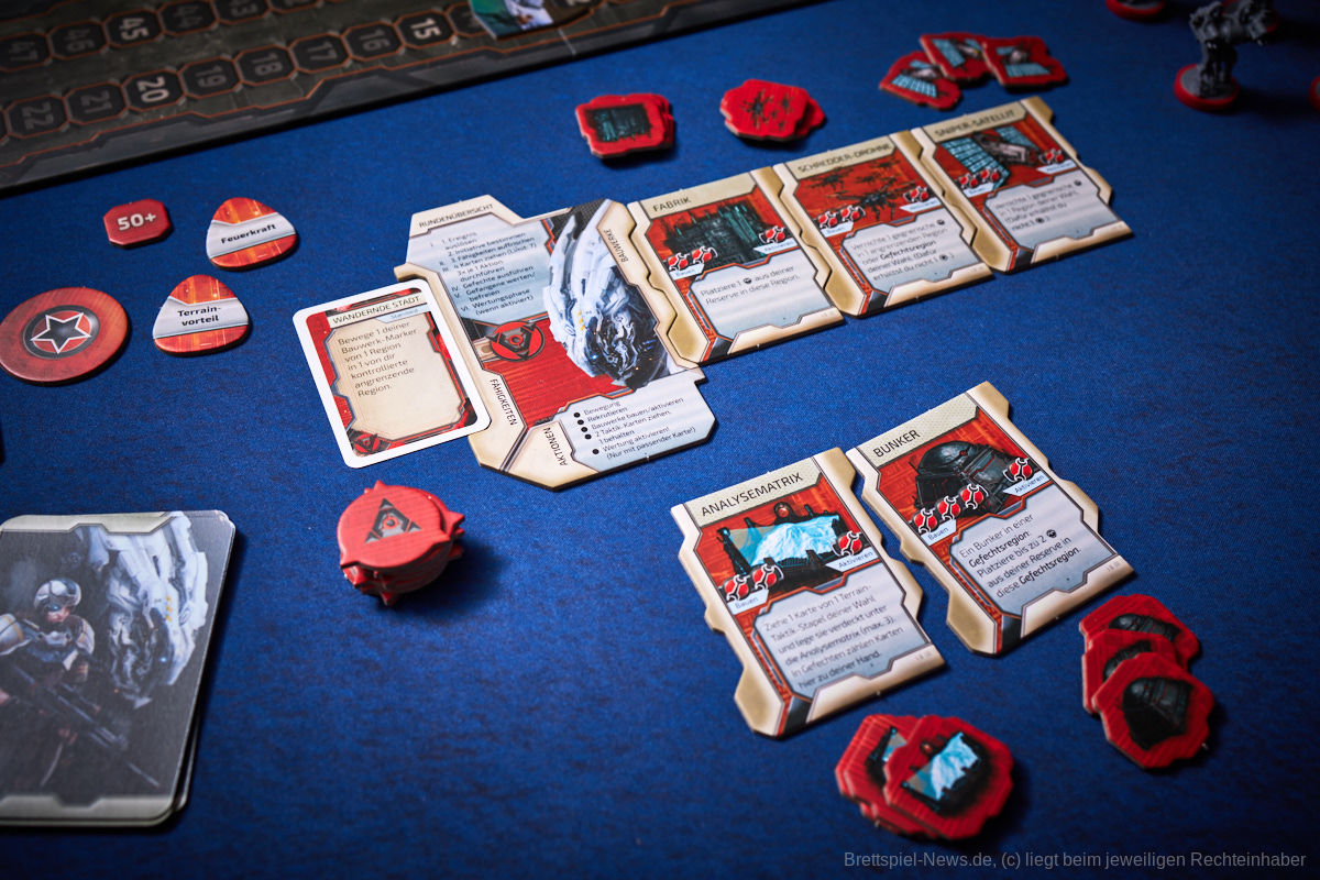 Ich schreibe an der Stelle außerdem absichtlich Strategie im Singular, da es für die Fraktionen im Kern meist nur eine wirkliche Strategie zum Sieg gibt, was einen größeren Einschnitt in die Spieltiefe darstellt. Natürlich gibt es unterschiedliche Fähigkeiten, die besonders erfahrene Spielgruppen ansprechen sollen, aber unterschiedlich kombinierbare Spieltableaus, wie es zum Beispiel bei „Scythe“ der Fall war, sucht man hier vergeblich. Auch erinnerten mich die Spielrunden an einigen Stellen an „Risiko“, da sich alles ein wenig gleich anfühlte. Da über fünf Runden die exakt gleichen Aktionen mit einem eher gering modifizierbaren Kartenstapel durchgeführt werden, gehen die Spielzüge zwar schnell von der Hand, interessant gestaltet es diese aber nicht immer.