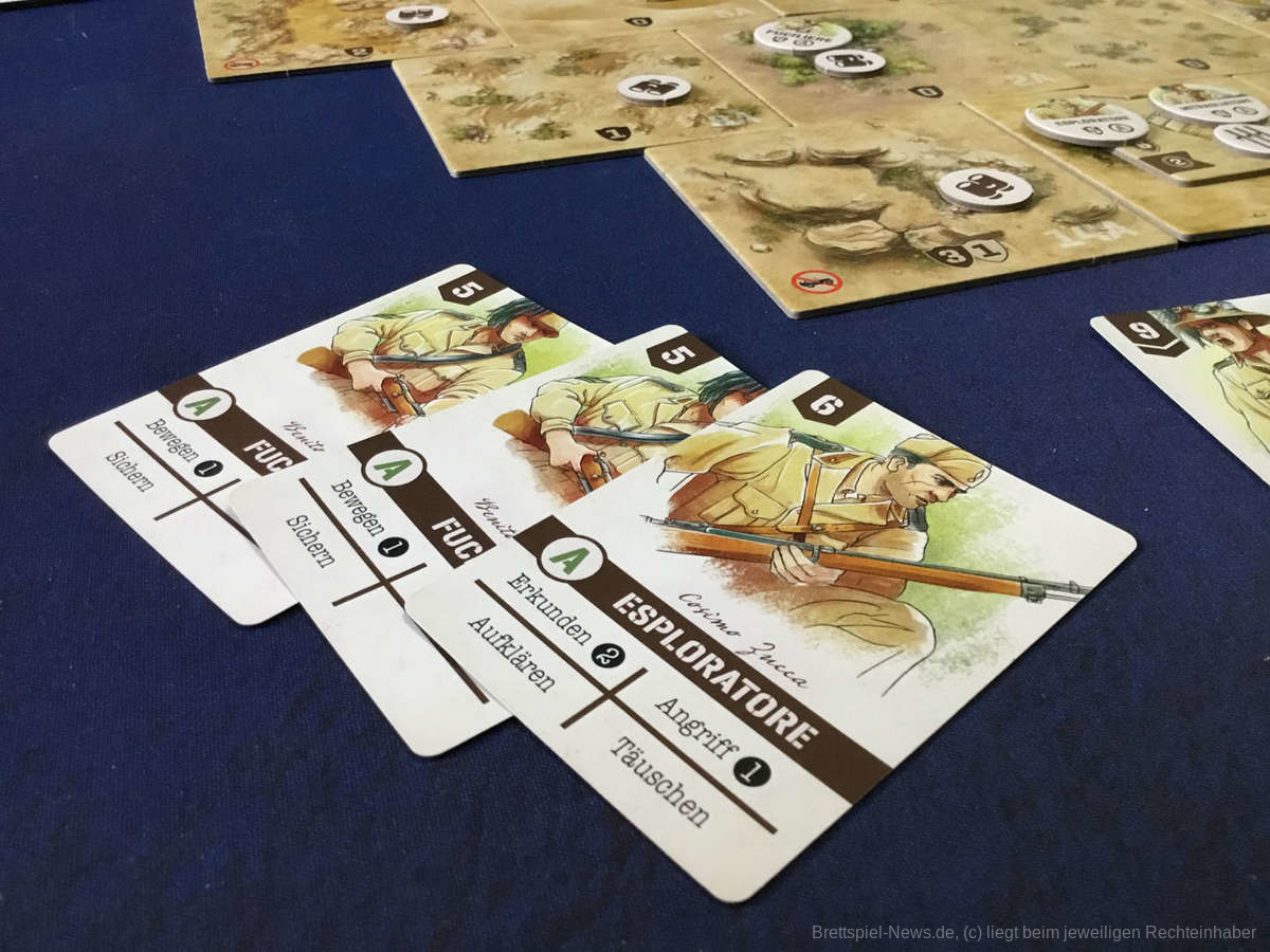 Selbstverständlich gibt es dabei klassische Aktionen wie „Bewegen“ oder „Angriff“. Die Zahl dahinter gibt an, wie viele Felder sich eine Einheit bewegen oder wie viele Würfel sie bei einem Angriff werfen darf. Essenziell für die Truppenbewegung ist die Erkundung des Geländes, da normale Truppen nur erkundete Felder betreten können. Die Aufklärung bringt allerdings auch ein lästiges Problem mit sich: Für jedes erkundete Feld kommt auch eine „Unklare Lage“-Karte in den Abwurfstapel. Da sie den kleinsten Zahlenwert haben und keinerlei Fähigkeiten besitzen, verstopfen sie nach und nach die Kartenhand. Um sie loszuwerden müssen die Scouts und Esploratores ihre „Aufklären“-Fähigkeit einsetzen. Das entfernt die Plagegeister zwar ganz aus dem Spiel, kostet aber natürlich eine wertvolle Aktion. Von Szenario zu Szenario kommen neue Truppen oder auch Fahrzeuge ins Spiel, welche die vorhandenen Regeln erweitern.
