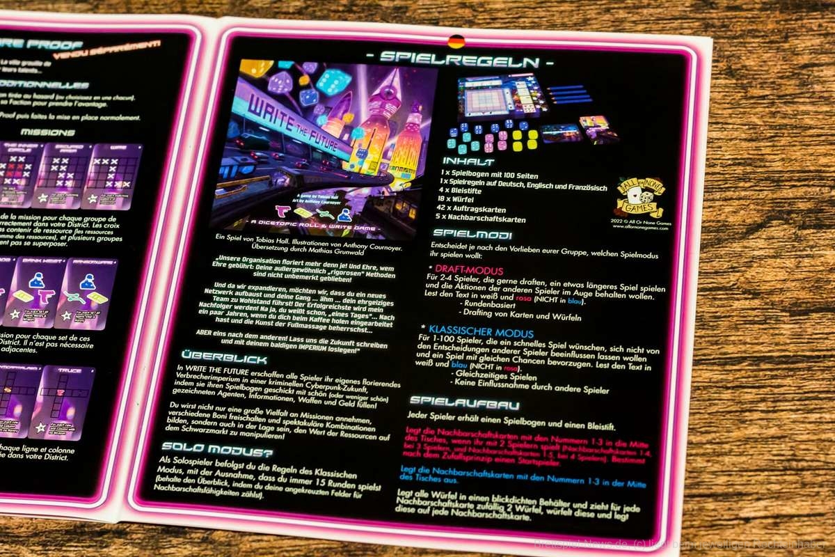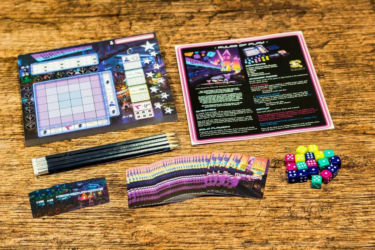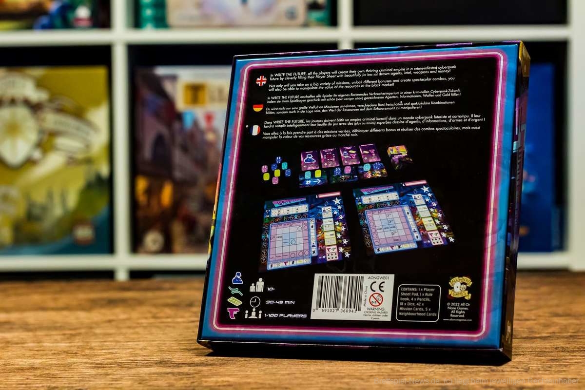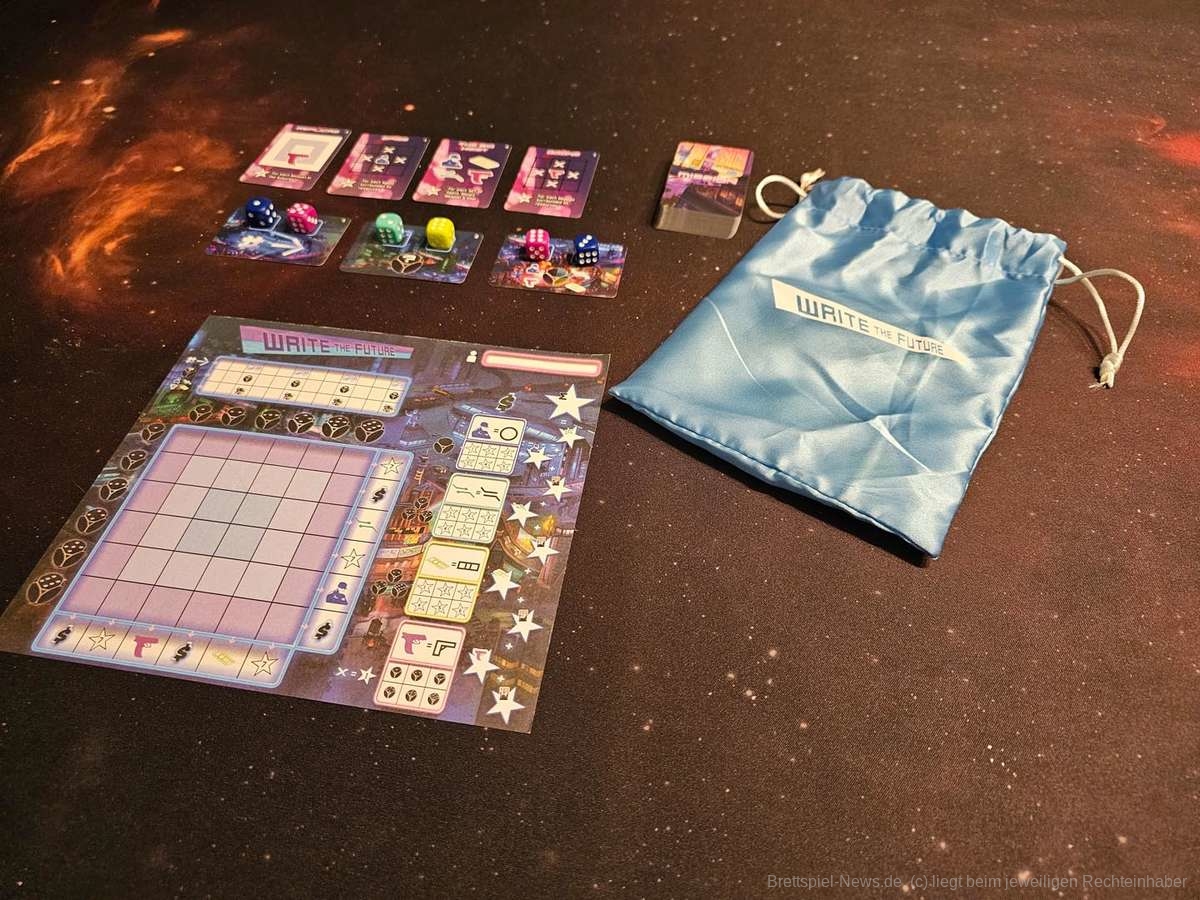 Bei “Write the Future“ handelt es sich um ein Roll & Write-Spiel, bei dem die Spielgruppe in zwei unterschiedlichen Modi gegeneinander antreten kann. Im ersten Modus handelt es sich um ein eher solitäres Spiel, bei dem alle Personen am Tisch die gewürfelten Ergebnisse nutzen können, während der zweite Modus eine Art „Drafting“ ins Spiel einführt.
