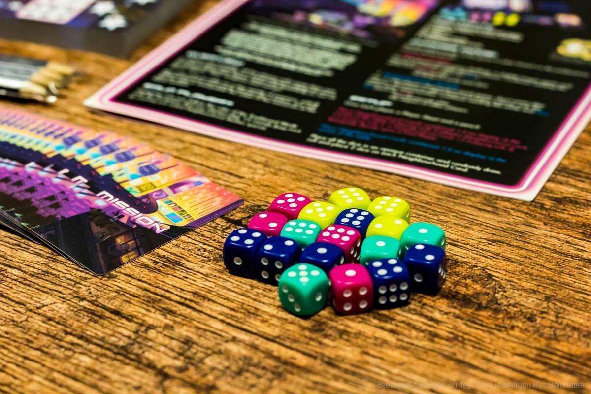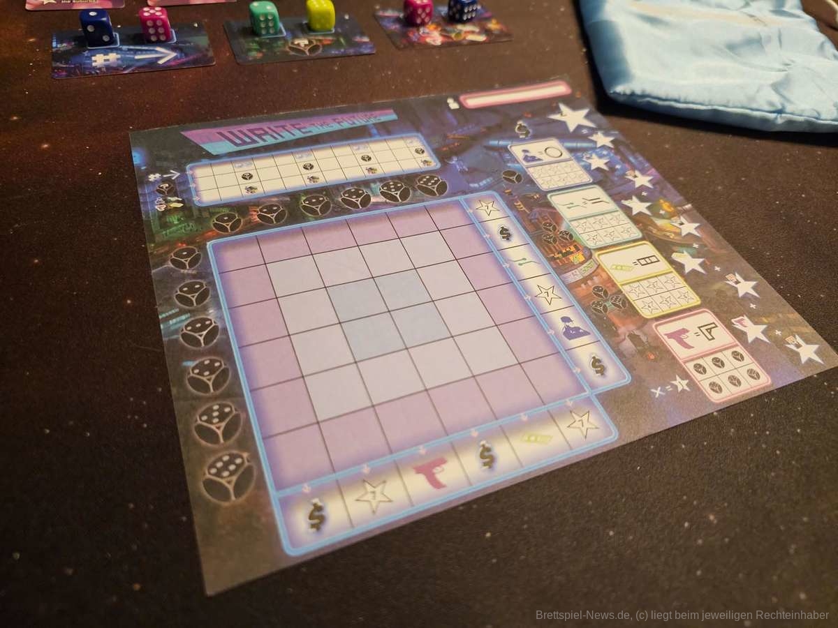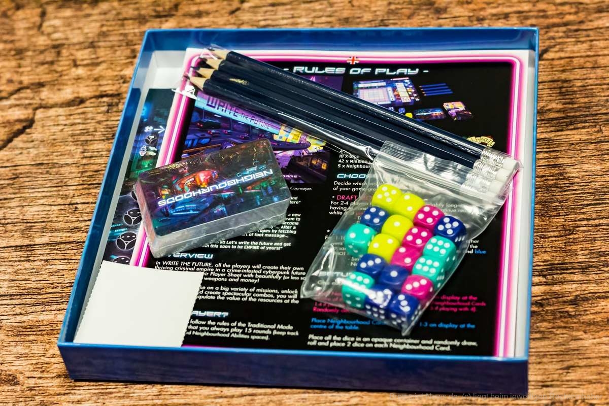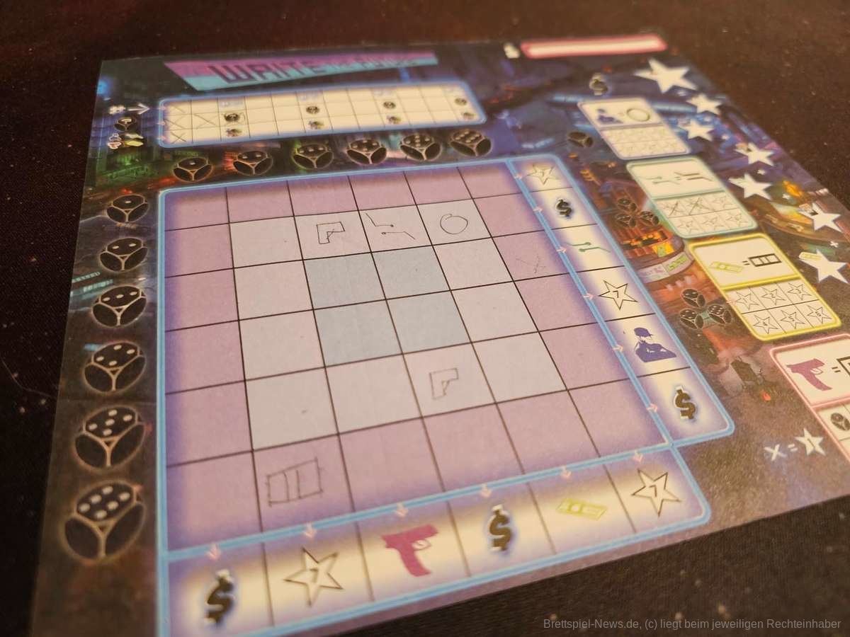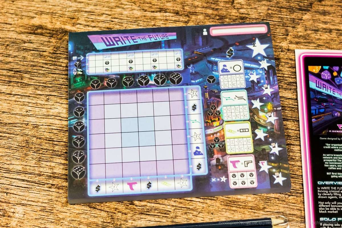Zu guter Letzt nutzt “Write the Future“ auch das eigene Setting nicht wirklich aus. Würfel werden geworfen, Symbole werden nach Vorlage (Missionskarte) eingesetzt. Repeat. Außer, dass die Symbole aus Geldscheinen, Schaltkreisen, Crew-Mitgliedern und Pistolen bestehen macht kaum etwas den Eindruck einer Stadt, die von Kriminellen kontrolliert wird. So bleibt “Write the Future“ leider weit hinter seinen Möglichkeiten zurück. Auch wenn mir die grafische Gestaltung und die Grundideen gefallen haben, bleibt “Write the Future“ ein absolutes Zufallsspiel, das weit im Schatten der Konkurrenz zurückbleibt.