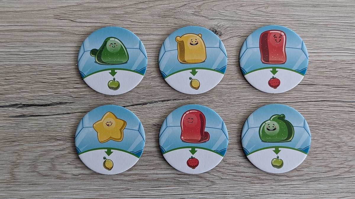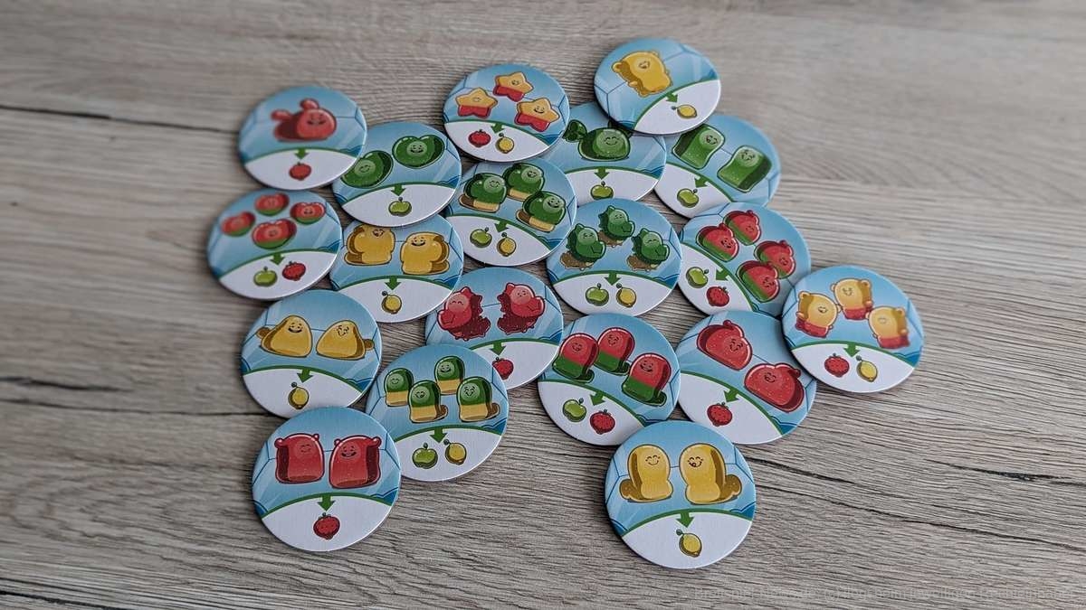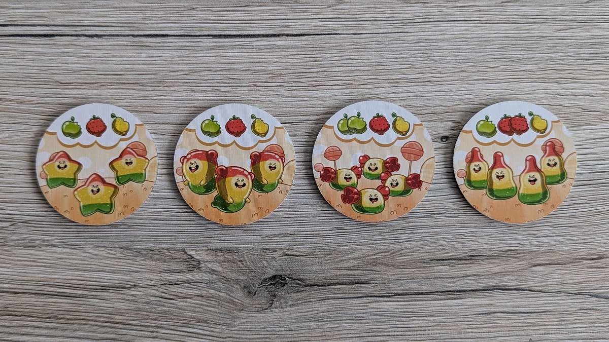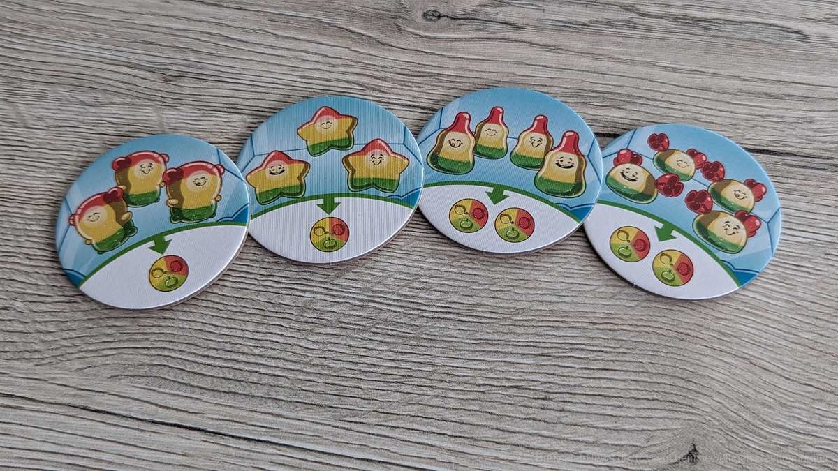 Bei den Jüngeren am Tisch kam es in unseren Partien mitunter vor, dass die Zuckerdosen leicht verrutschten. Dadurch mussten die herausschauenden Plättchen des Öfteren wieder zurückgeschoben werden. Deutlich vermindern konnten wir dies durch den Einsatz einer Spielmatte auf dem Tisch. Somit kein großes Problem für mich. Ein für die Kinder sehr besonderer Aspekt sind die freizuschaltenden neuen Plättchen. Diese nach Früchten (Ananas, Orangen, Brombeeren) sortierten exotischen Gumminis bringen neue und interessante Aktionsmöglichkeiten ins Spiel. So können nun unter anderem Gumminis kopiert oder die Auslage der anderen Kinder beeinflusst werden. Da dies stets in einem überschaubaren Rahmen bleibt, fördert dies den Spielspaß in hohem Maße, ohne unnötige Frustration zu wecken.