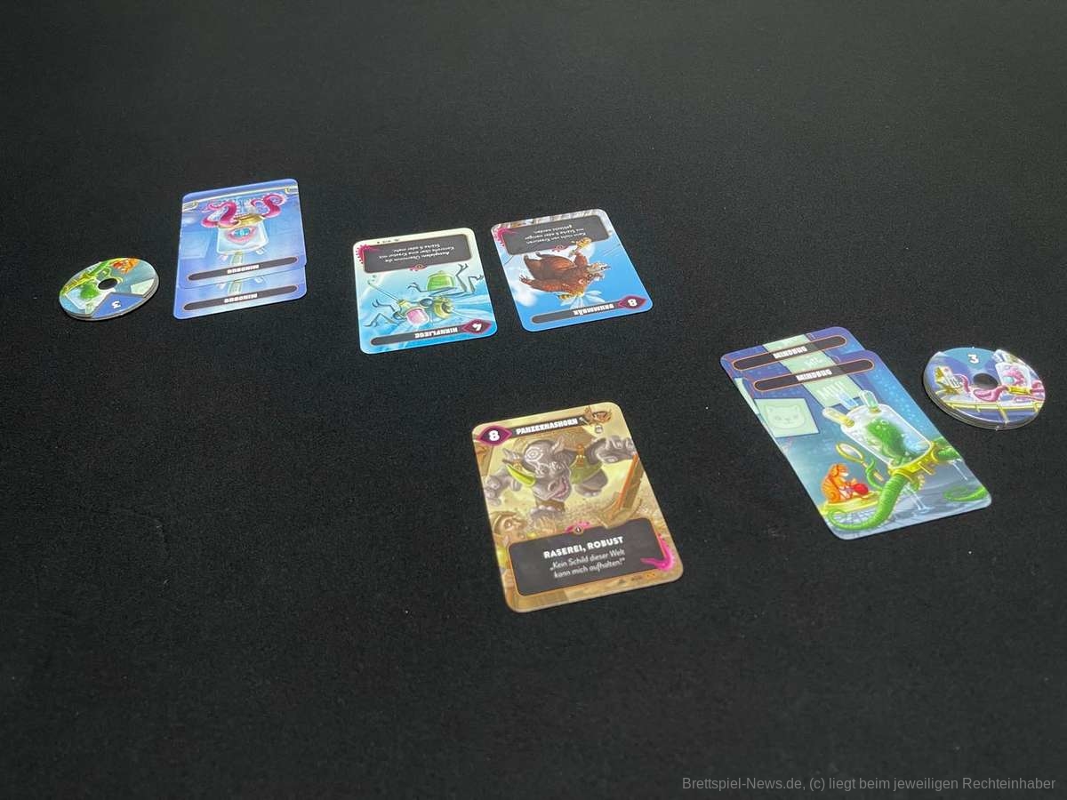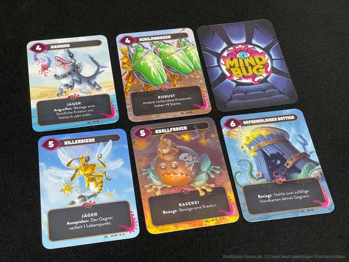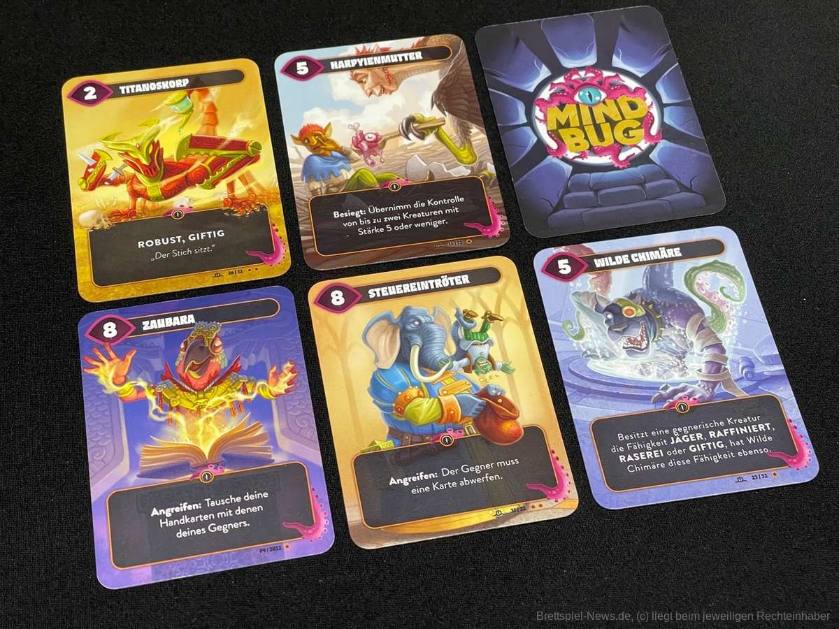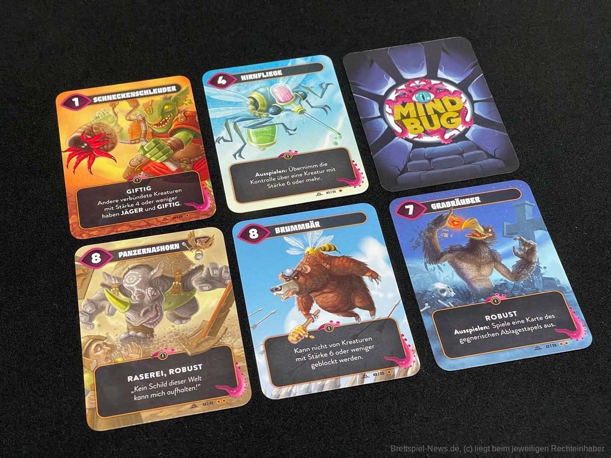 Wie die Spielbeschreibung schon andeutet, ist "Mindbug" kein ausuferndes Spiel mit verschiedensten Spielkomponenten und stundenlanger Spielzeit. "Mindbug" ist in jeder Hinsicht klein und elegant und schafft es, mit 48 Karten herausfordernde Duelle zu erleben.