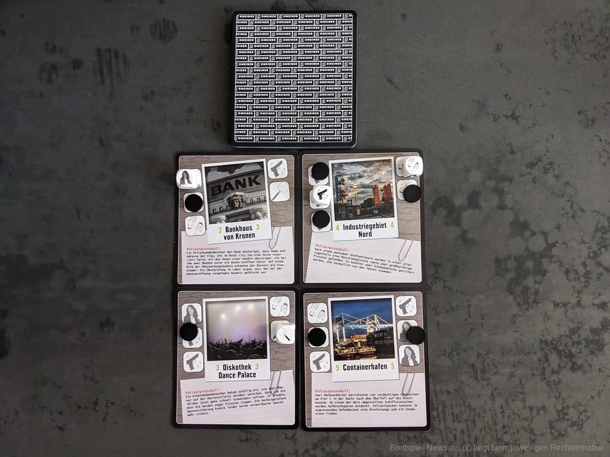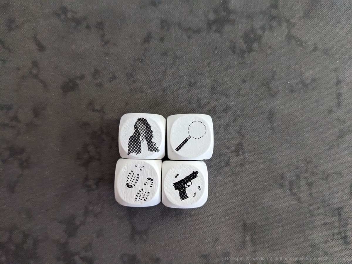 Um an Ortskarten heranzukommen, müssen alle Personen am Tisch reihum mit vier Würfel würfeln, um Ermittlungssymbole auf den Ortskarten abzudecken. Die Person, die das letzte offene Symbol auf einer Karte abdeckt, erhält das Ortsplättchen und die darauf abgedruckten Siegpunkte. Auf den Würfeln sind neben den vier Ermittlungssymbolen Tatwerkzeug, Zeuge, Spuren und Labor auch noch zwei Polizeimarken pro Würfel abgebildet. Im jeweiligen Zug dürfen die Würfel bis zu zweimal gewürfelt werden. Polizeimarken können für direkte Siegpunkte oder bei zwei Polizeimarken als Joker für ein beliebiges Ermittlungssymbol eingesetzt werden.