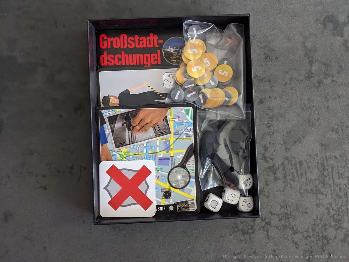 In „Großstadtdschungel“ versuchen wir, einen Kunstraub aufzuklären und dabei besser als die anderen Ermittler abzuschneiden, denn nur dem cleversten Ermittler winken Ruhm und Ehre. Im Spiel selbst sammeln wir Punkte durch den Gewinn von Ortskarten, für auf der Einsatzzentrale abgelegte Würfel und das Erraten der beiseitegelegten Ortskarten am Ende der Partie.