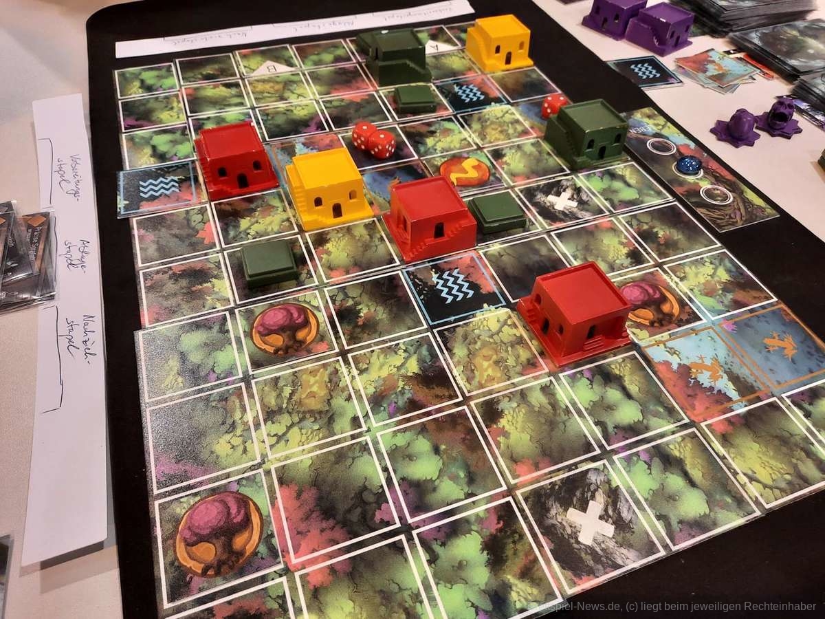 Wenn ich irgendwo „HYBR“ lese werde ich schon einmal aufmerksam. Dieser Verlag bringt ausschließlich Hybrid-Spiele auf den Markt und das Spiel „Soviet Kitchen“ hatte mir damals richtig viel Spaß gemacht. Jetzt arbeitet der Verlag zusammen mit „Elznir Games“ an dem Spiel „Towers of Yoma“. Ich konnte zusammen mit einem Kollegen Christian einen Blick auf den Prototypen werfen. Für gewöhnlich haben Spiele von „HYBR“ immer eine App, die zum Spielen benötigt wird. Diese Rolle hat noch eine Erklärerin von „Elznir Games“ übernommen, da sie sich, wie der Rest des Spiels, noch in der Entwicklung befindet.