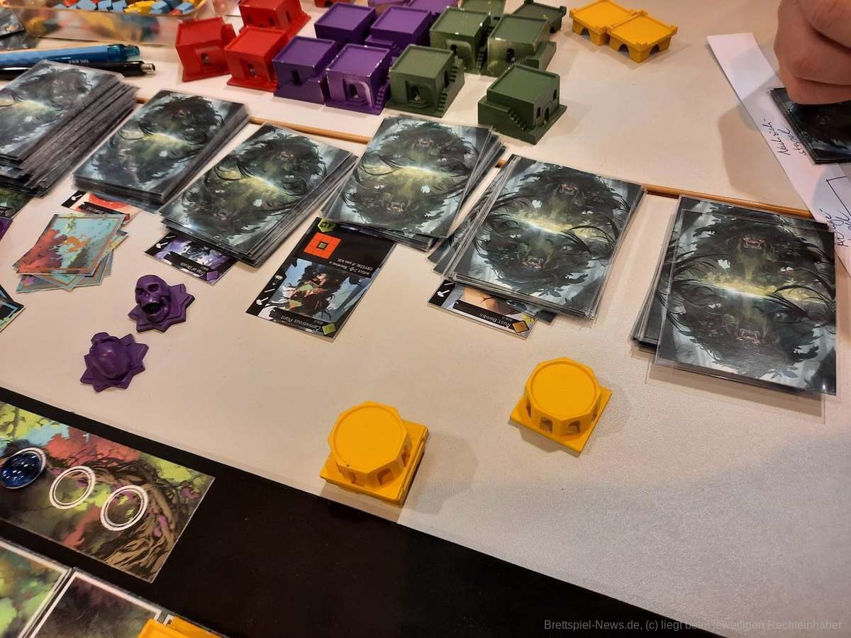 Die paar Artworks, die wir gesehen haben, machen aber schon Lust auf das finale Spiel. Und wenn die App am Ende diese klobige Verwaltunsaufgabe abnehmen kann, dann sehe ich durchaus Potential in dieser Idee. Kooperatives Deckbauspiel mit App-Anbindung klingt in meinen Ohren schon sehr verlockend.