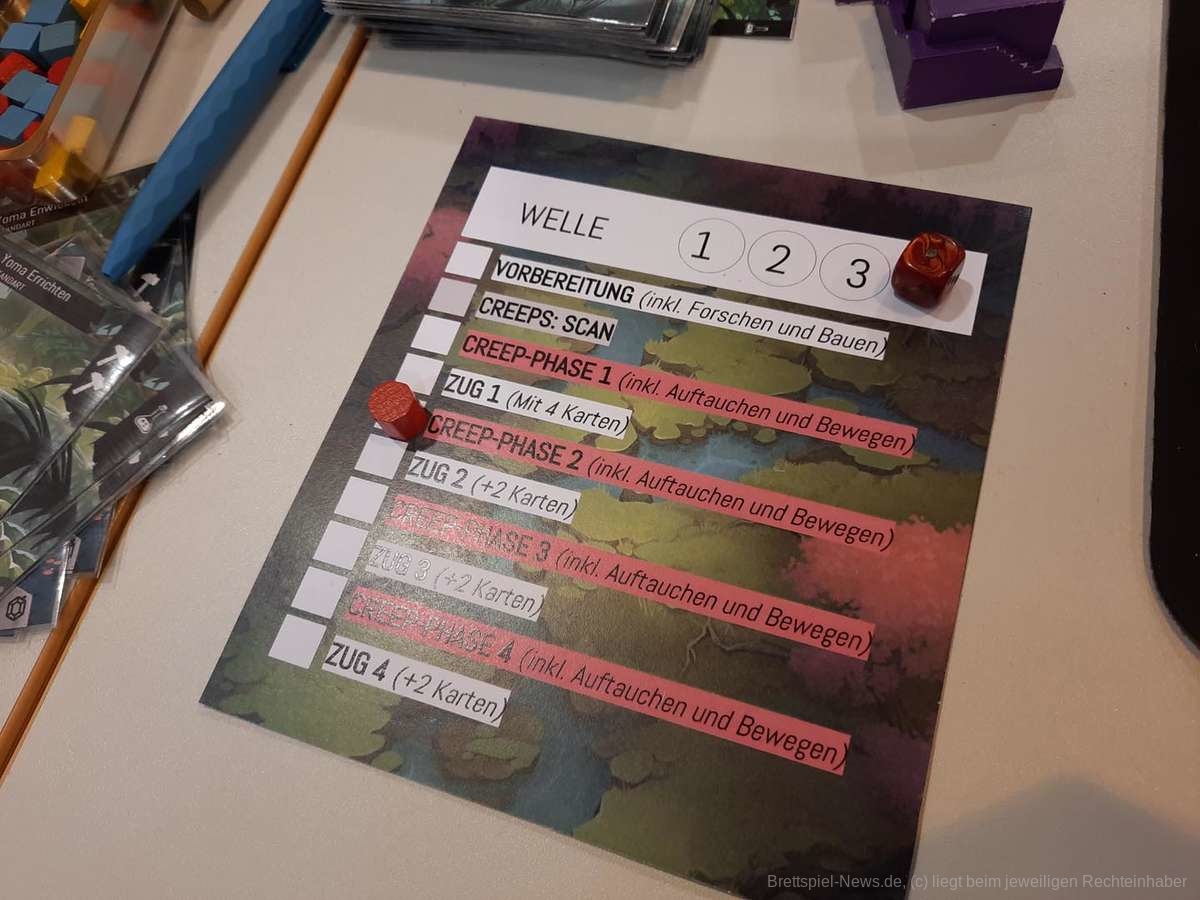 Wir haben alle einen gemeinsamen Zug, indem wir uns besprechen können, wer wann welche Karte ausspielen sollte. Danach bewegen sich die Gegner, hier noch „Creeps“ genannt und neue Creeps betreten den Plan. Diese sind verschieden große Würfel, um die Lebenspunkte mit den Würfelaugen festzuhalten und sie von der Art unterscheiden zu können. Neben kleinen Minions gab es auch gepanzerte Maschinen, die etwas schwerer zu besiegen waren.