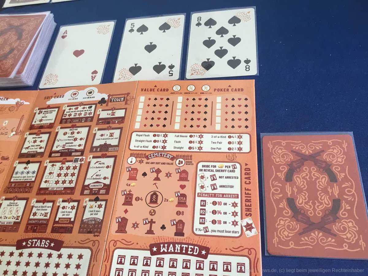 Der Stapel Pokerkarten wird gemischt. Eine Karte geht verdeckt an den Sheriff. Sie entscheidet später darüber welche Strolche verhaftet werden. Im Anschluss haben alle fünf Züge, wobei für jeden Zug drei Pokerkarten aufgedeckt werden. Eine Karte wird für das persönliche Pokerblatt gewählt. Nach der Zugphase bringt es Geld und Siegpunkte ein. Dabei ist ein höheres Ergebnis natürlich auch mehr wert. Die zwei anderen Karten legen fest in welchem Bereich des Tableaus etwas markiert wird. Dazu dienen jeweils die Farbe der einen und der Zahlenwert der anderen Karte. So wird mit der Farbe Karo die Mine besucht, der Wert der anderen Karte entscheidet welche Abzweigung der Mine markiert werden darf. Alle dürfen die drei Karten so einteilen wie sie es möchten. So kann eine Person eine Karte für ihr Pokerblatt nutzen, während eine andere sie für Farbe oder Wert nutzt.
