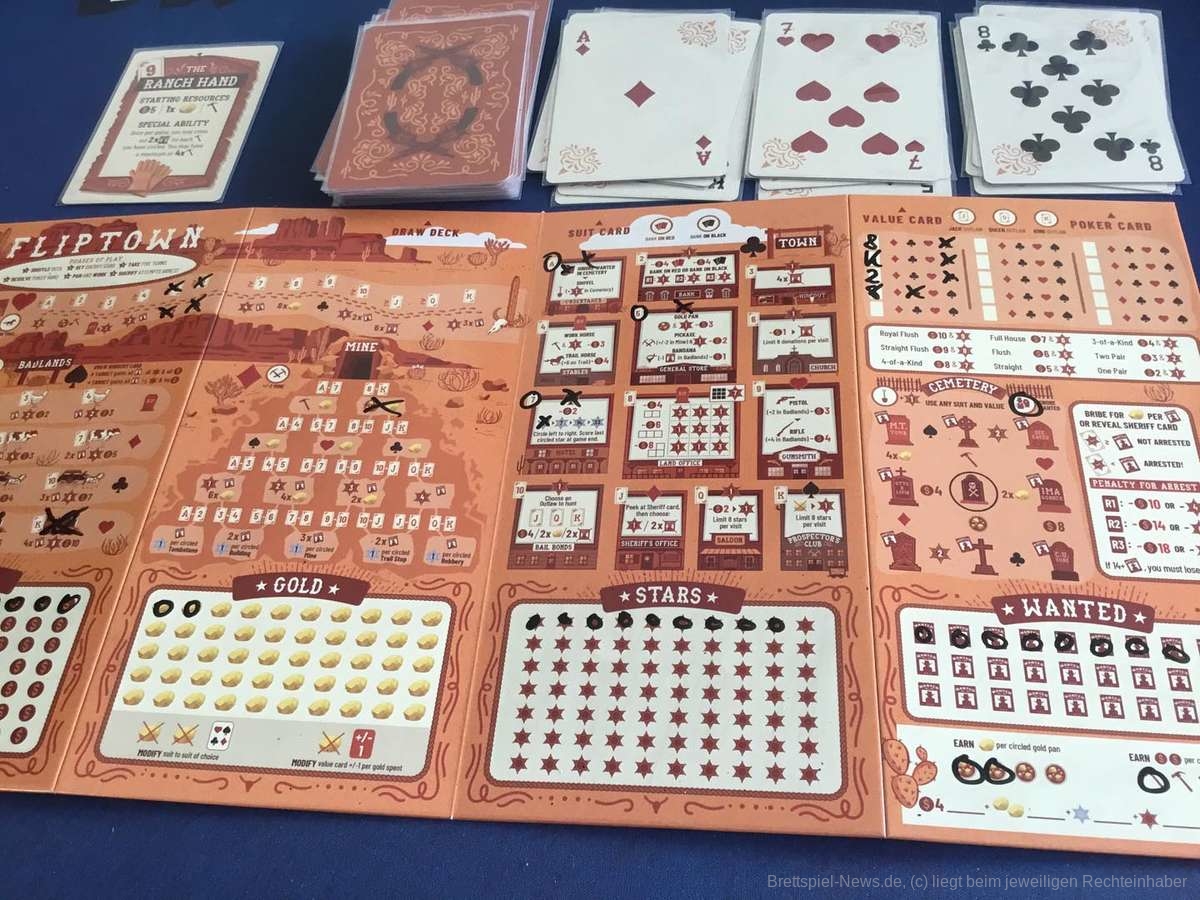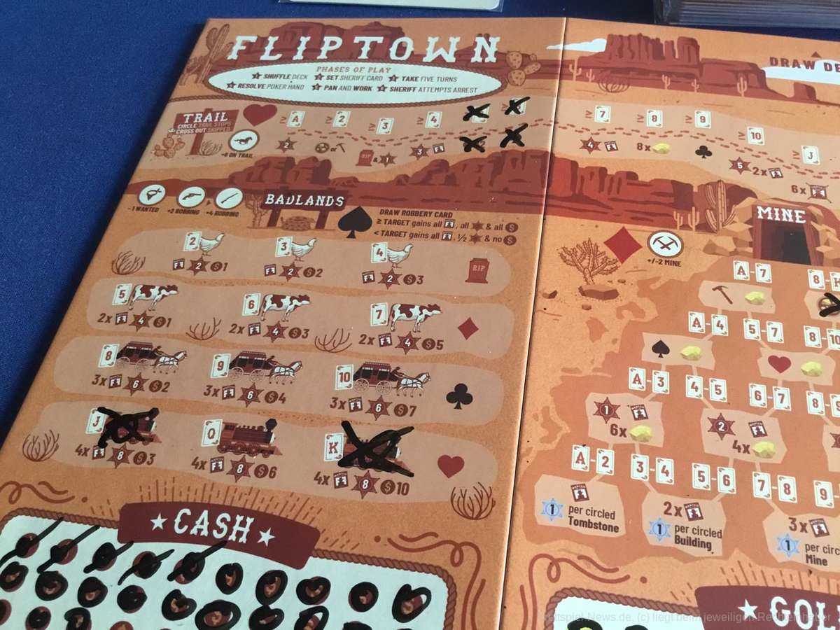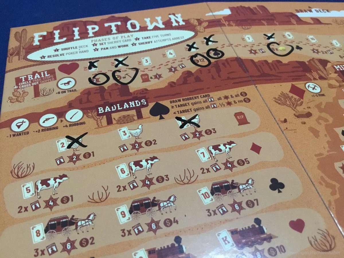Ein paar Karten, ein abwischbarer Spielplan und ein Stift sind alles was nötig ist, um in den wilden Westen zu reisen. Drei Runden dauert jede Partie „Fliptown“. Egal ob allein oder mit bis zu vier Personen, der Ablauf bleibt stets gleich.