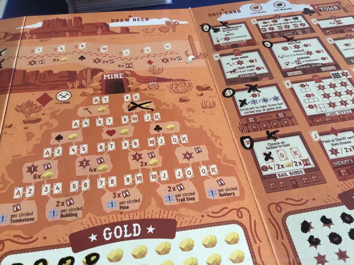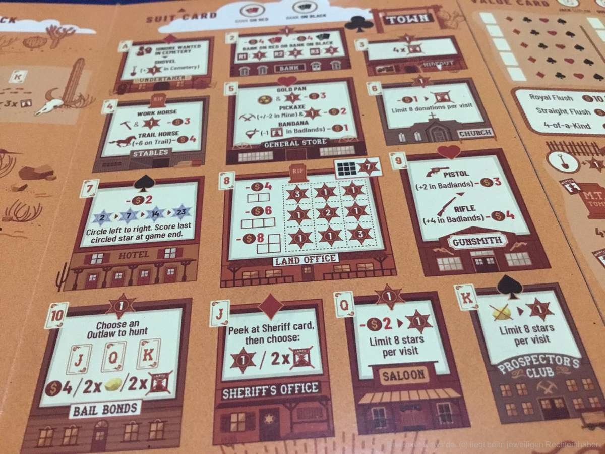 Ein Halstuch verringert die Steckbriefe für Überfälle und wer den Totengräber zweimal aufsucht, bekommt sogar eine Schaufel von seinem Freund und erhält fortan auch noch Siegpunkte beim Gräber plündern. Das Reisen auf dem Trail und das Schürfen in der Mine lassen sich aufbessern und bieten ganz eigene Wege um an Punkte zu gelangen. Eine Ideallinie gibt es aber nicht. Jeder Weg kann beschritten werden und jeder kann auch zum Sieg führen. Die Verflechtung durch die Zusatzaktionen macht alles auch mechanisch reizvoller.