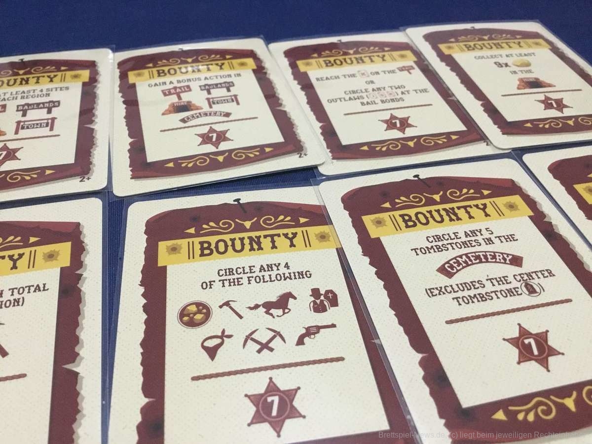 Nebst des eigenen Tableaus gibt es allerdings noch ein paar kleine Extras. Die Kopfgeldkarten bieten Anreize für verschiedene Meilensteine im Spiel. Wer sie zuerst erreicht, bekommt mehr Punkte als andere Mitspielende. Nicht immer passen die Ziele einer Kopfgeldkarte auch zur eigenen Strategie. Zum Gewinnen ist es aber auch nicht nötig jedes Kopfgeld zu kassieren. Statt gleicher Startressourcen stehen auch noch Charakterkarten zur Verfügung. Jede von ihnen gibt individuelle Startressourcen vor und bietet auch eine einmalige Sonderfähigkeit. Da kann der Outlaw mal einen Überfall machen ohne dafür Steckbriefe zu bekommen oder der Siedler darf ein Gebäude in der Stadt aufsuchen. Auch hier gibt es vielfältige Möglichkeiten.