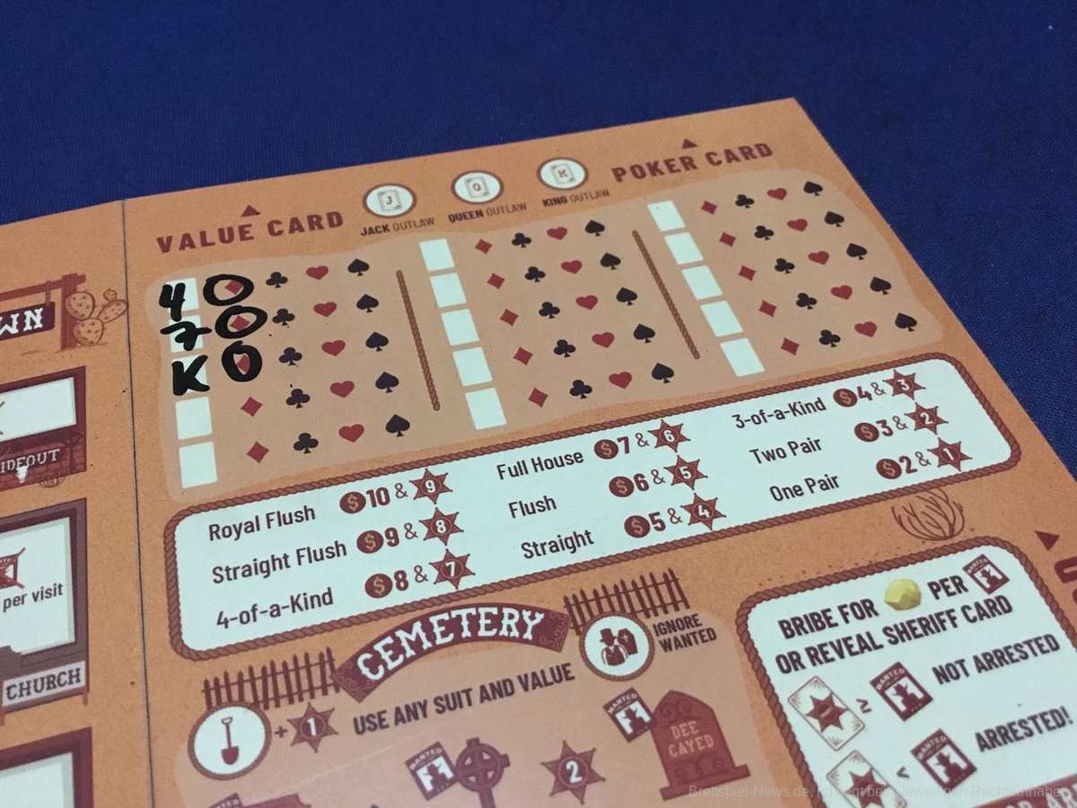 Wer etwas für thematische und etwas komplexere Roll’n-Write-Spiele hat, der dürfte mit „Fliptown“ eine gute Zeit haben. Die Regeln sind relativ einfach und wirklich jede Kleinigkeit steht zum Nachlesen an der richtigen Stelle. Wann werde ich verhaftet? Welche Karte muss ich mindestens ziehen um den Zug erfolgreich zu überfallen? Welche Belohnung bekomme ich für eine Straight oder ein Full House?