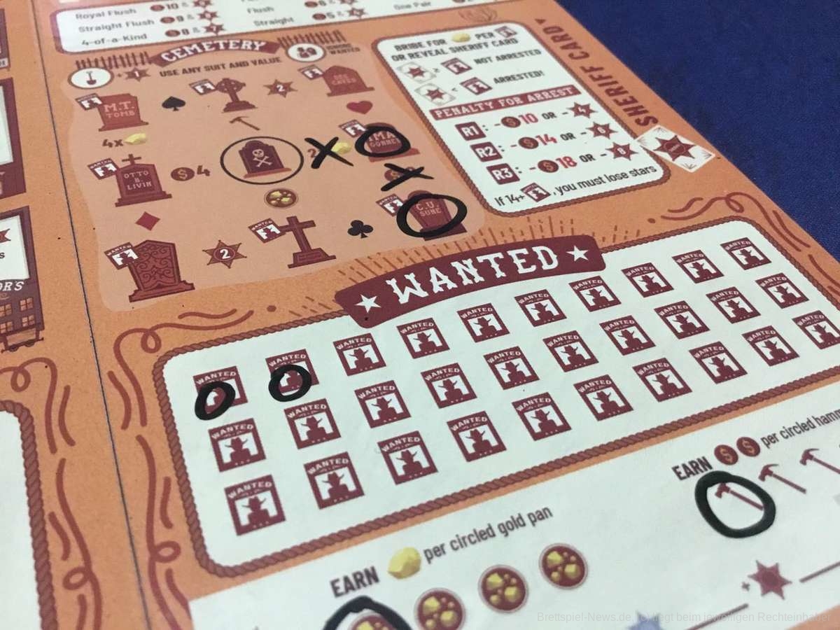 Wer nichts mit den ausliegenden Karten anfangen kann, darf aber auch immer den Friedhof nutzen. Auch im wilden Westen ist Grabräuberei allerdings nicht gern gesehen und schnell ist das eigene Konterfei auf mehr Steckbriefen als einem lieb sein kann. Anders verhält es sich natürlich, sollte vorher der örtliche Totengräber in der Stadt besucht worden sein. Als hilfsbereiter Freund ist es absolut unverdächtig, mit dem Spaten auf dem Friedhof, seinem guten Freund ‚behilflich‘ zu sein.