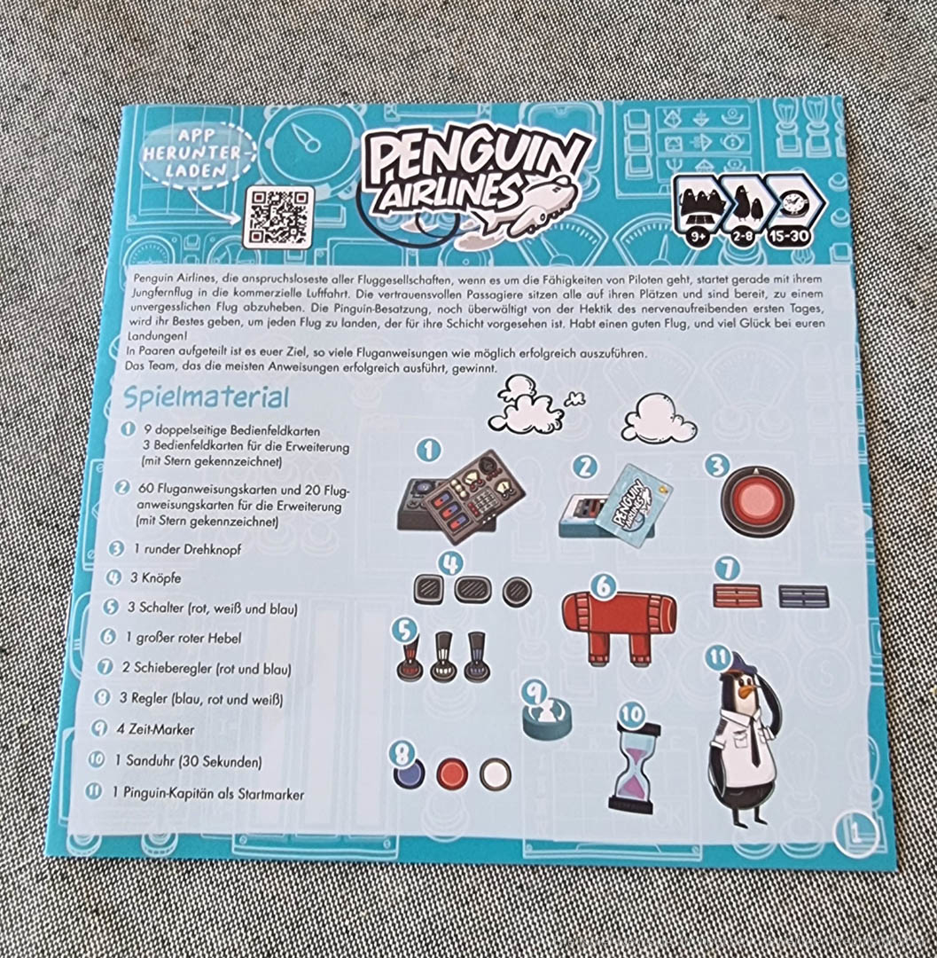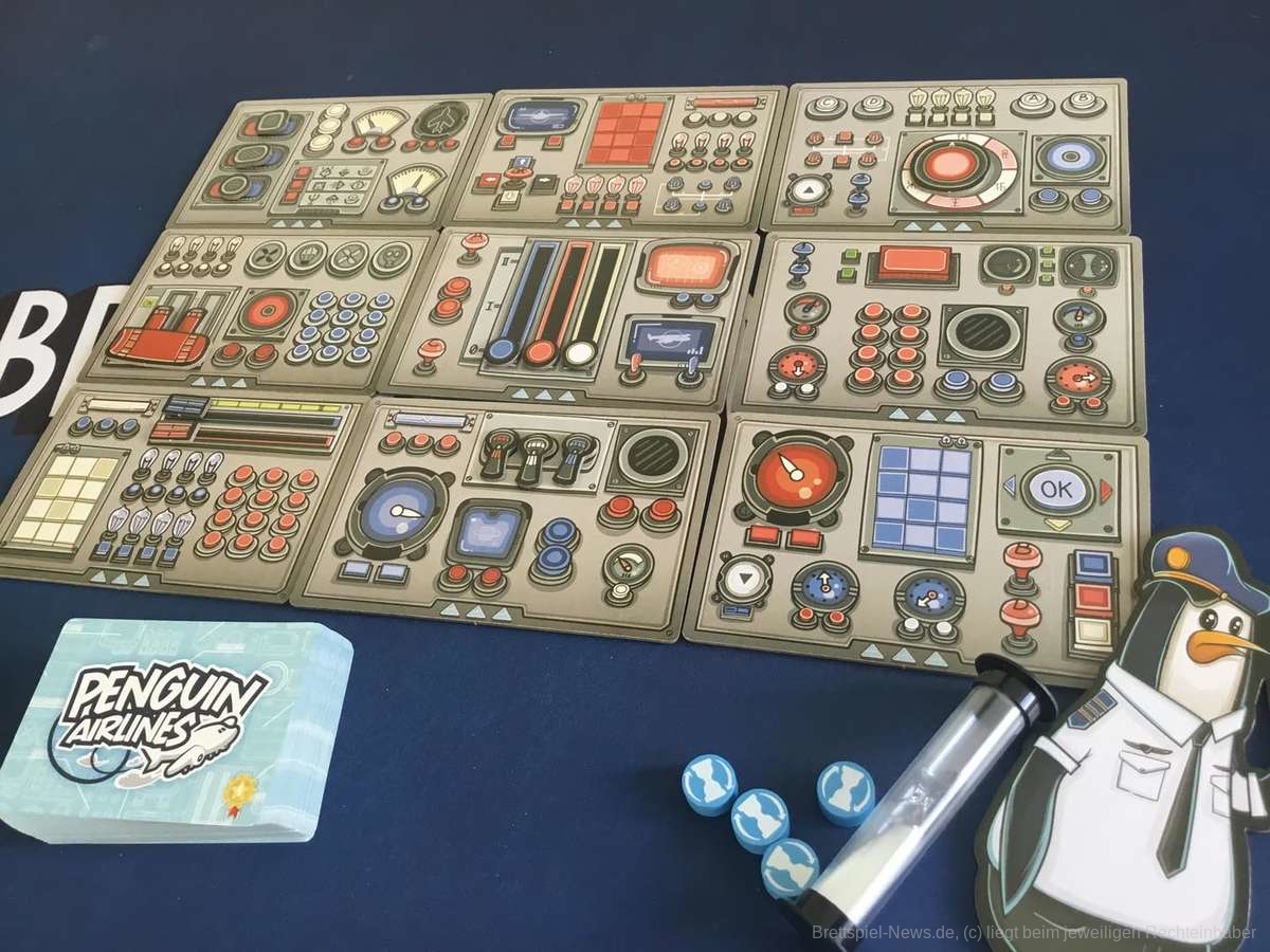 Für erfahrene Crews gibt es drei zusätzliche Instrumententafeln und die dazu passenden Aufgabenkarten. Damit sich niemand die Position der Instrumente merken kann, befinden sich auf den Rückseiten der Instrumententafeln andere Anordnungen der Schalter. Das Spielprinzip bleibt dabei unverändert. Generell ist jede Partie eine sehr konzentrierte Sache. Wer Spaß an Spielen mit Zeitdruck hat, wird mit „Penguin Airlines“ eine witzige und kurzweilige Zeit haben.