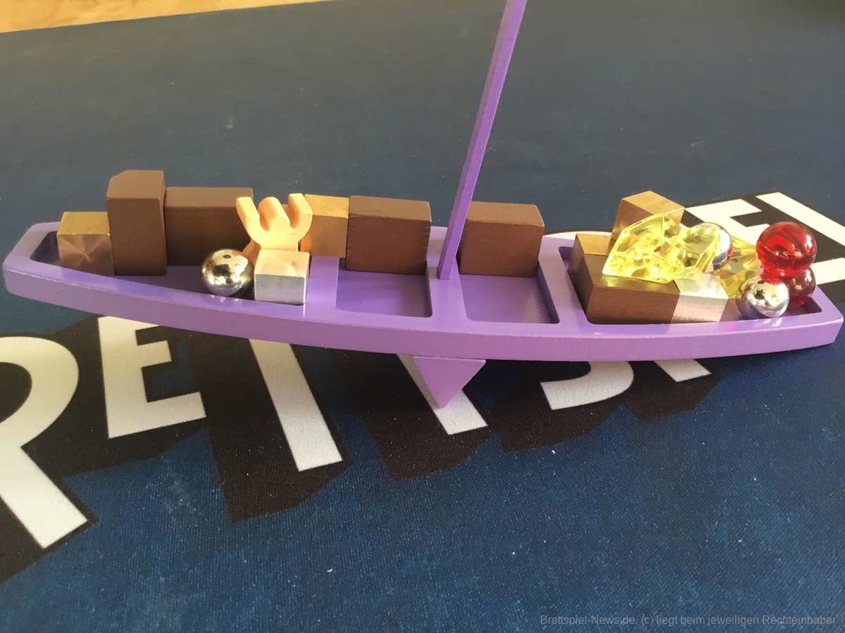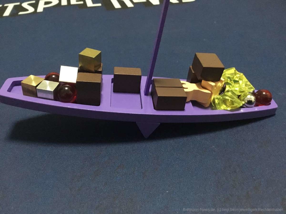Doch ganz so einfach ist es nicht. Der Clou ist, dass alle Beutestücke unterschiedlich sind. Gold- und Silberwürfel sind zwar gleich groß, aber Gold ist sehr viel schwerer. Gleiches gilt für die runden Perlen aus Glas und Stahl. Der Edelstein ist zwar leicht, hat jedoch sehr viele Flächen und keine davon ist eben. Wer dennoch alles an Bord bekommt, ist wirklich geschickt.