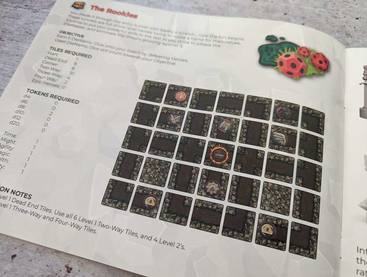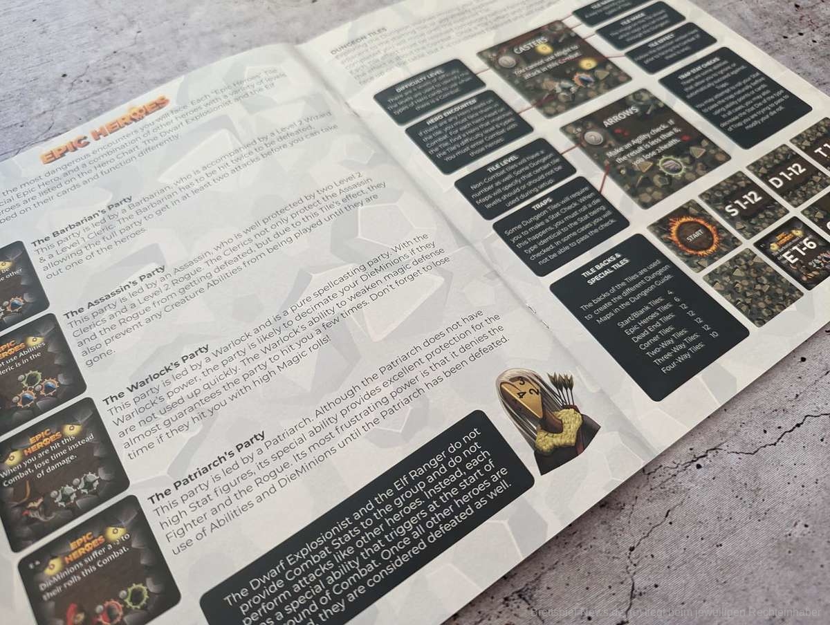 Neben dem fehlerhaften Regelheft gab es auch beim Dungeon Guide, der die einzelnen Level beschreibt, Unstimmigkeiten, die mich ein weiteres Mal verwirrt haben. Er wurde scheinbar falsch gedruckt, sodass der erste Dungeon, der abgebildet ist, eigentlich der Finale inkl. Bosskampf ist. Man muss sich hier quasi von hinten nach vorne durcharbeiten. Nachdem ich das in einem Forum gelesen habe, war die Sache zwar klar, aber schön ist anders.