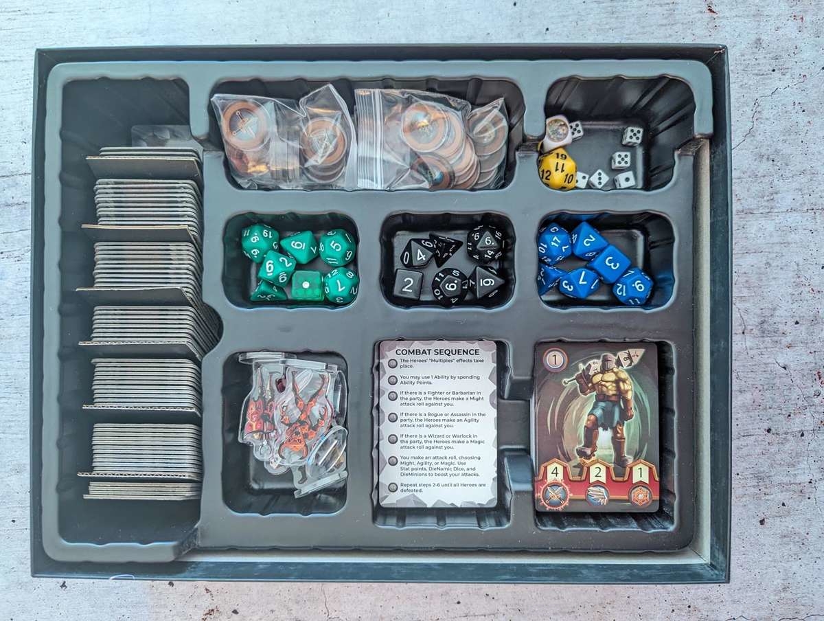 Hinzu kommt, dass sich Spielhilfe und Regeln nicht zu 100% decken. Eine wichtige Info steht z.B. auf der Hilfe, im Heft habe ich sie nicht gefunden. Das führt zu einiger Verwirrung. Gut, dass es zur Einführung einen Extra-Dungeon gibt, in dem man die Grundlagen lernt und die ersten Kämpfe besteht. Sobald alles Wirrwarr der Regeln geklärt ist, laufen die Runden in „Die in the Dungeon“ dann schnell und flüssig ab.