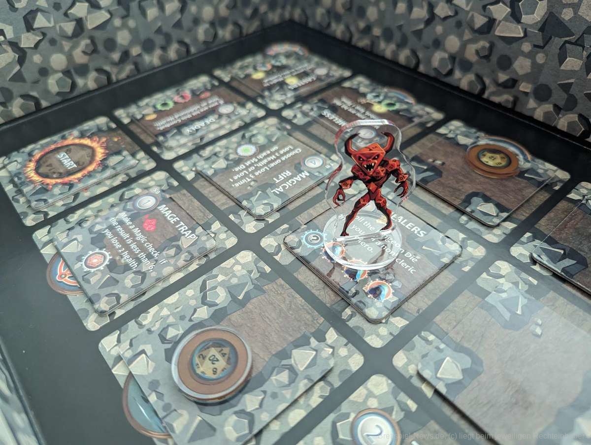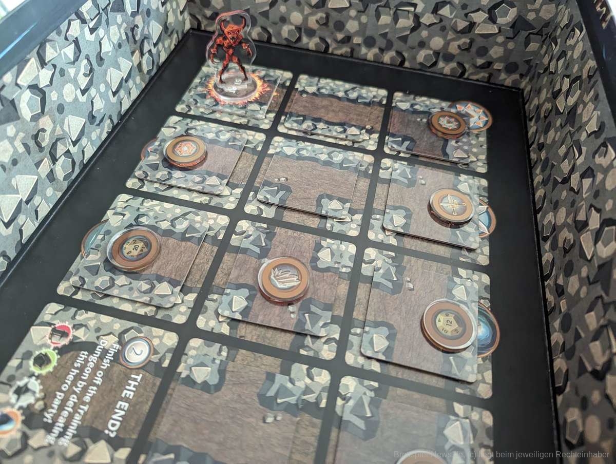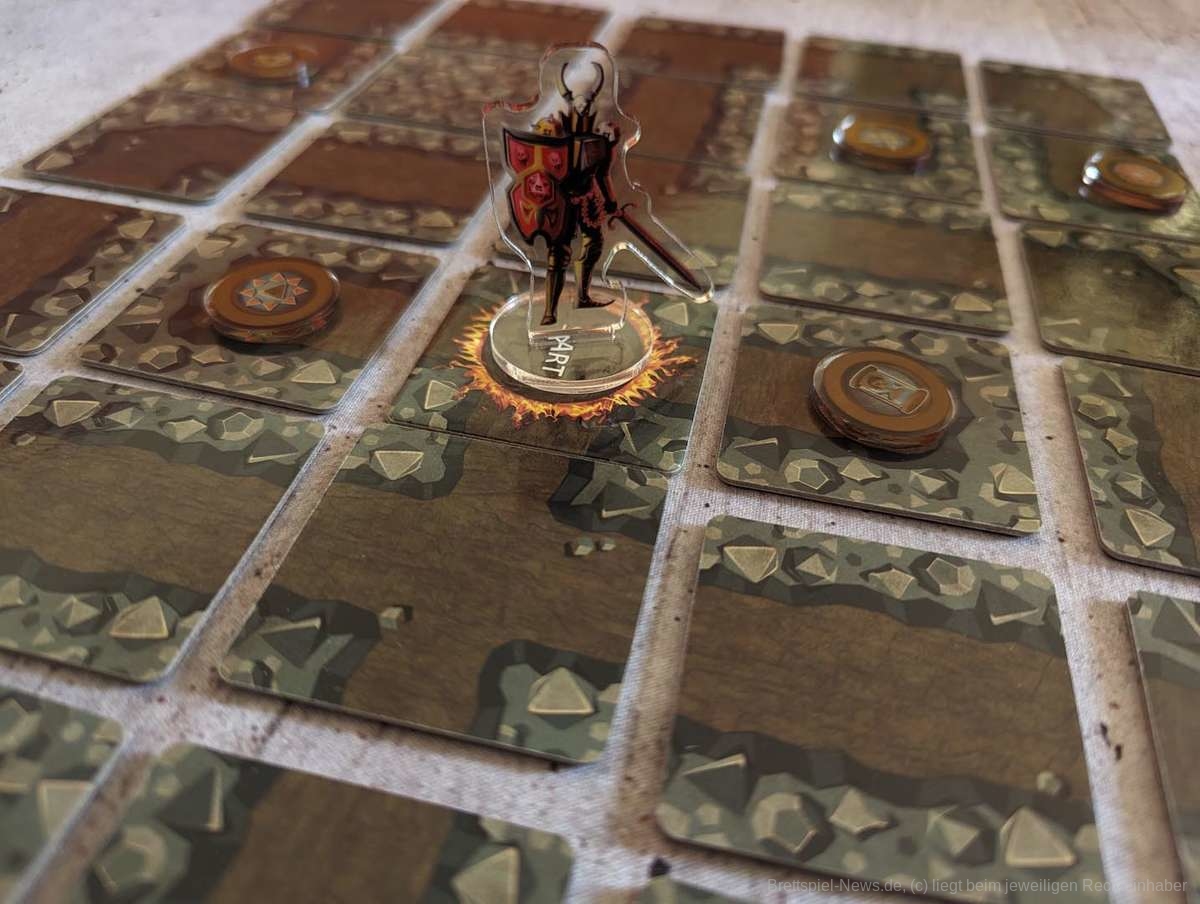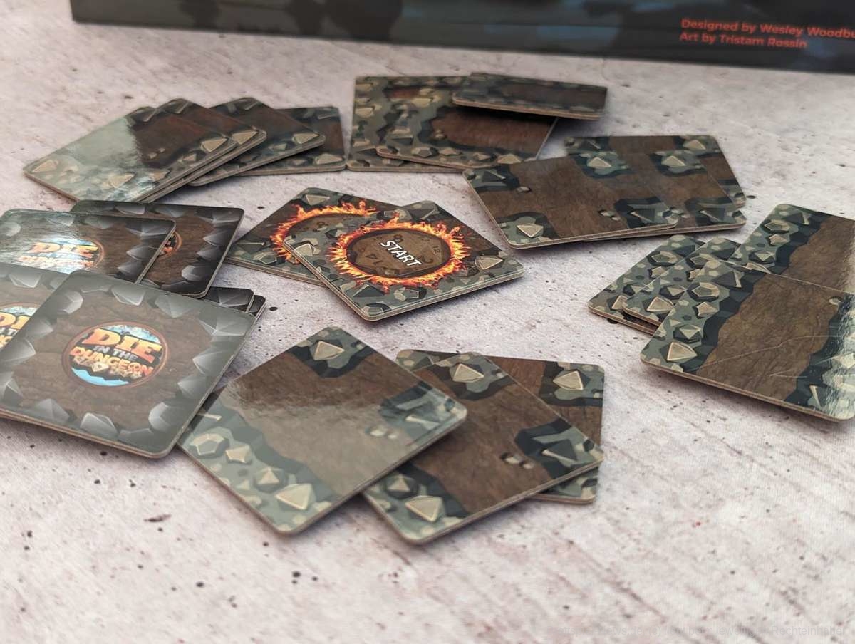 Die Level selbst sind abwechslungsreich gestaltet und haben unterschiedliche Ziele. Schade, dass man auch hier den fehlenden Feinschliff merkt. Es kann nicht nur passieren, dass man von einem Level zum nächsten Token mitnehmen darf, die dort aber direkt zum Aufbau benötigt werden, sondern auch, dass man verteilte Token, die man z.B. als Ziel einsammeln soll, bereits auf den einzelnen Plättchen im Dungeon beim Erkunden findet. Oft ist zwar beschrieben, welche Plättchen verwendet werden müssen oder rausfallen, aber eben nicht immer.