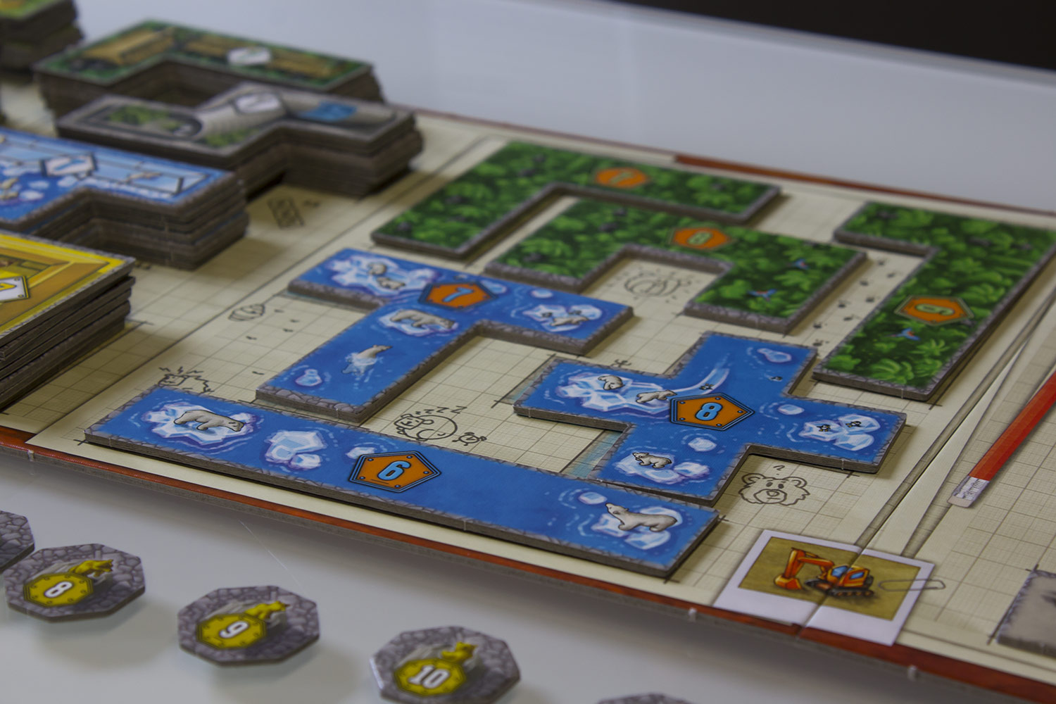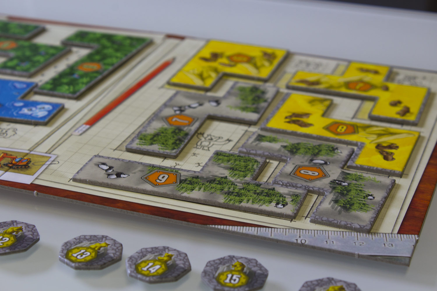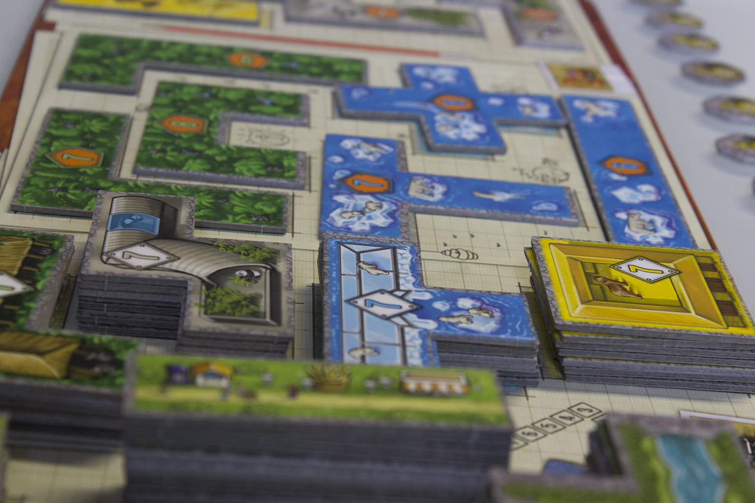 Die Plättchen müssen innerhalb des Parkgelände platziert werden. Zudem dürfen sie sich nicht überlappen oder “auf Kannte” angebaut werden. Es gibt auf jedem Bauland immer eine Grube, die nicht überbaut werden kann.