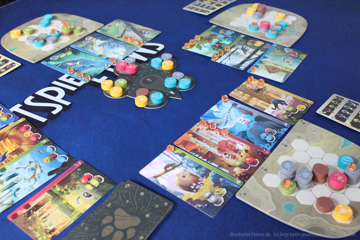 Das Spiel ist so schnell aufgebaut wie gelernt. Die Beschaffung der Steinchen ist dieses Mal ein einfacher Auswahlmechanismus. Suche dir eins von fünf Feldern aus und platziere die Steine auf deinem Plan. Optional kann noch eine Tierkarte dazu genommen werden, die einem ein kleines Ziel gibt, auf das hingearbeitet werden kann. Der Fokus liegt ganz klar auf der Puzzleaufgabe und die macht wirklich Spaß.