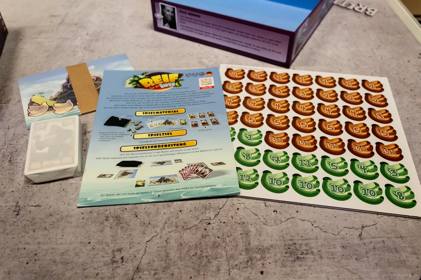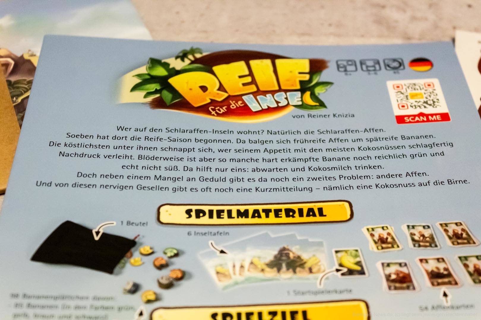 Die Regeln sind sehr einfach gehalten und ausreichend mit Bildern erklärt, so dass der Einstieg leicht fällt und "Reif für die Insel" von Anfang an schnell und flüssig gespielt werden kann. Das Regelheft umfasst 16 Seiten und ist in vier Sprachen unterteilt. Das gesamte Spielmaterial ist sprachneutral gehalten.
