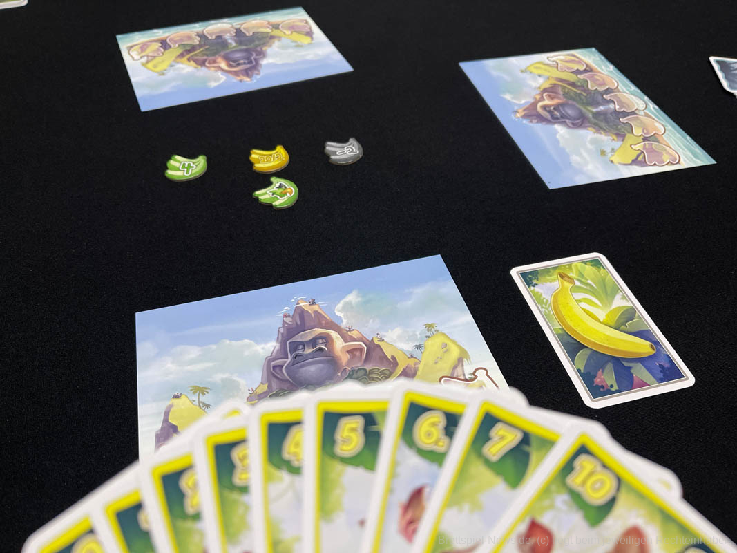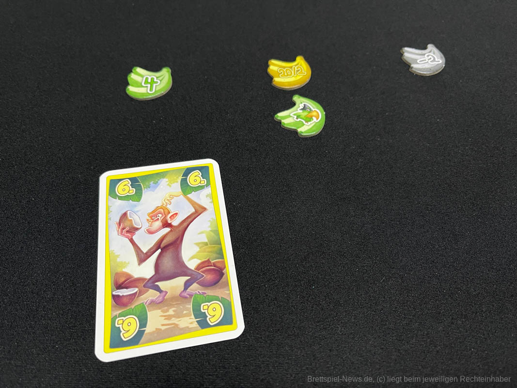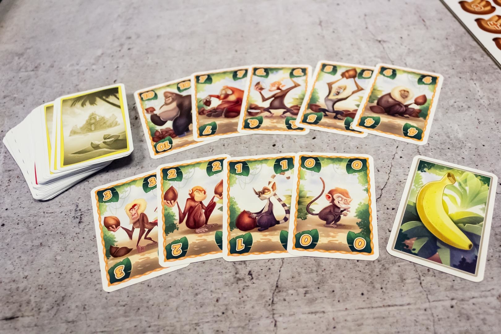 Das Thema finde ich passend zum Spielmechanismus gewählt. Man hat sofort einen Zeichentrickfilm im Kopf, wie sich die Affen um die Bananen streiten. Und wenn es donnert, trauen sich nur wenige Affen aus ihrem Versteck, um sich die Beute zu schnappen. Und dann das stolze Grinsen, wenn man die Beute in den Händen hält und sie Sekunden später von einem Papagei einfach weggeschnappt wird.