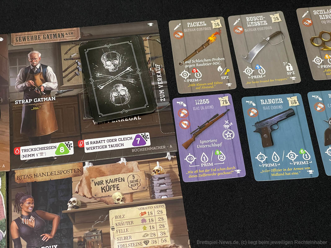 Das Artwork ist super und passend zum Thema gewählt. Die Ikonografie ist eindeutig und schnell zu lernen. Die Miniaturen für die Charaktere sehen hervorragend aus, ebenso die Holzressourcenmarker. Dazu gehört auch wie elegant Sichtweite gelöst ist. Es gibt mehrere Geländetableaus, die alle eine vernünftige Kartonstärke haben. Einfach tolles Material!