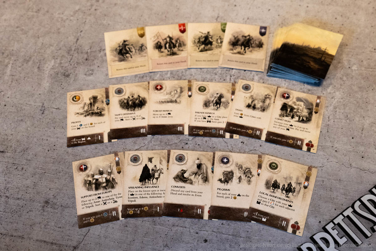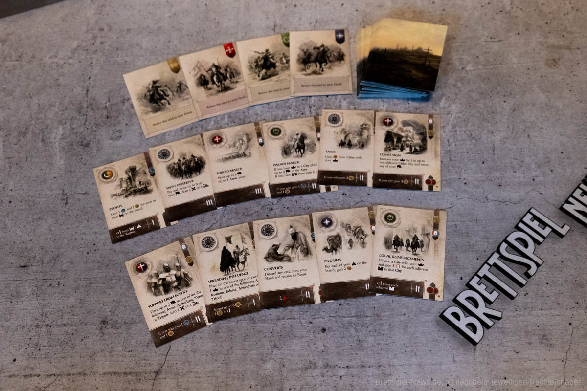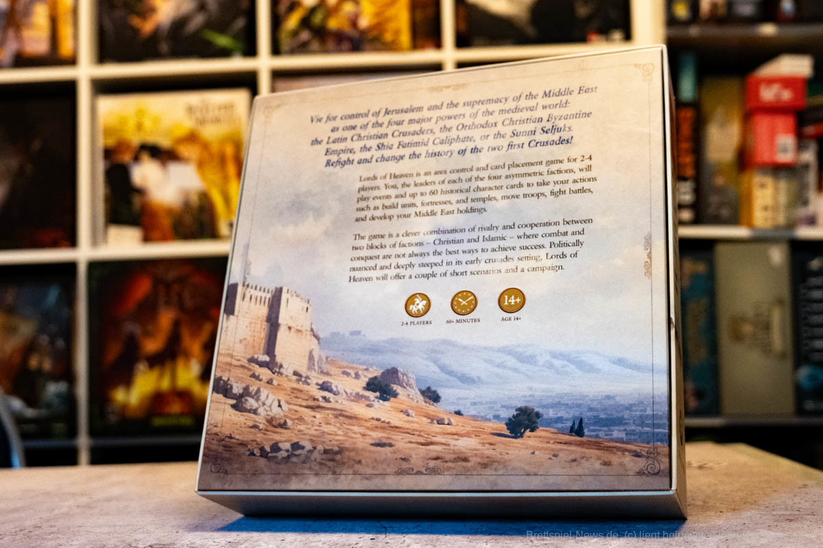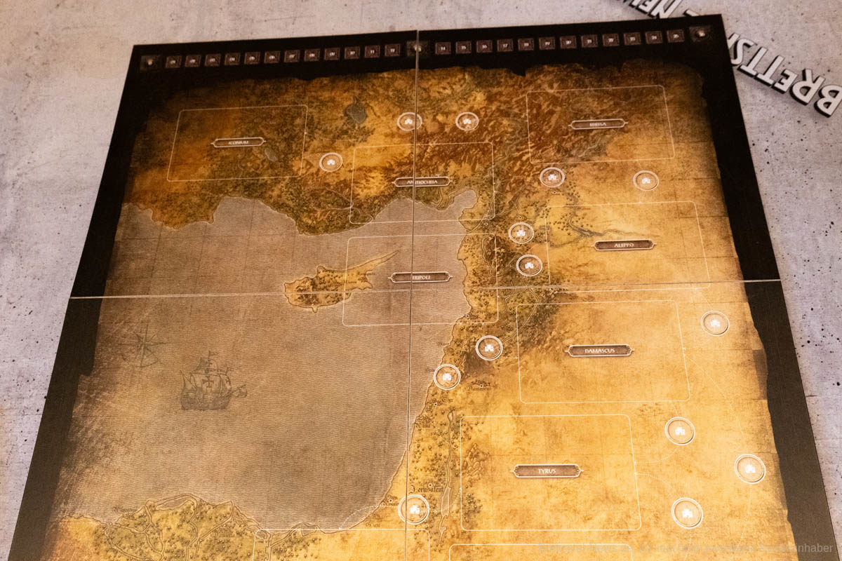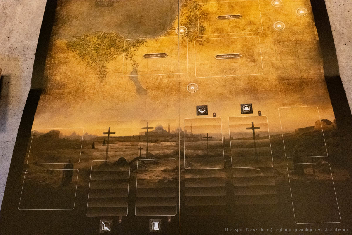 Thematisch entführt uns „Lords of Heaven“ in die Zeit der Kreuzzüge. Wir erleben die ersten beiden Kreuzzüge und können den Ausgang mit unseren Entscheidungen beeinflussen. Ich finde es sehr gut, dass sich getraut wurde auch die blutigen Episoden der Vergangenheit zu thematisieren. Ich persönlich bin in letzter Zeit zunehmend geschichtsinteressierter geworden und habe angefangen, Geschichtspodcasts zu hören. Dies war sicherlich auch ein Grund, weshalb mich das Spiel besonders interessiert hat, denn über die Kreuzzüge habe ich mir bisher wenig Gedanken gemacht. Leider verliert das Spiel etwas an Immersion, wenn keine epischen Schlachten geschlagen werden, sondern Würfel geworfen und anschließend Papptoken versetzt werden.