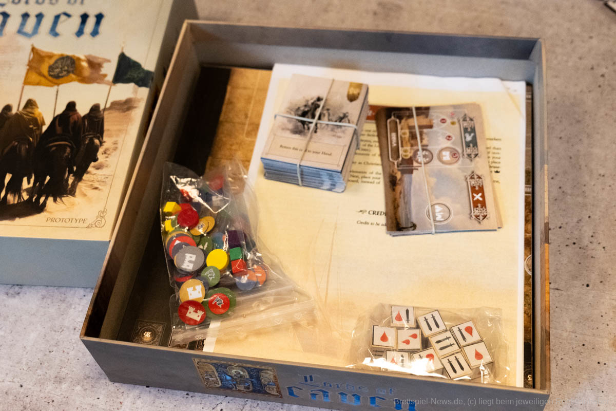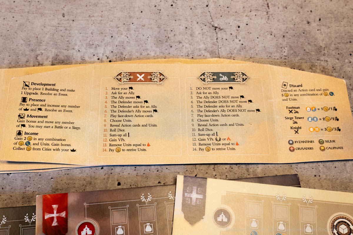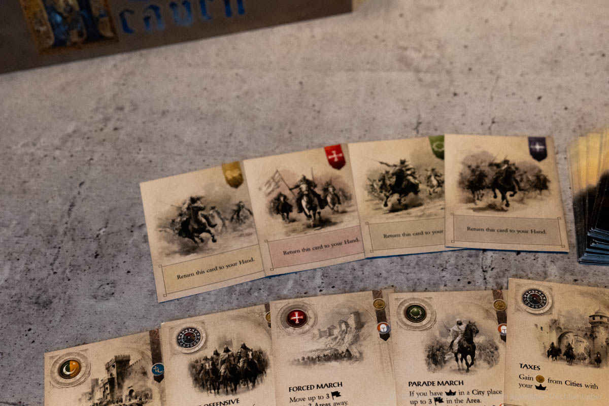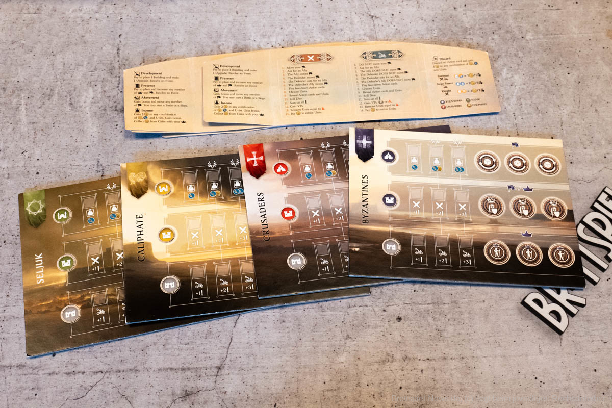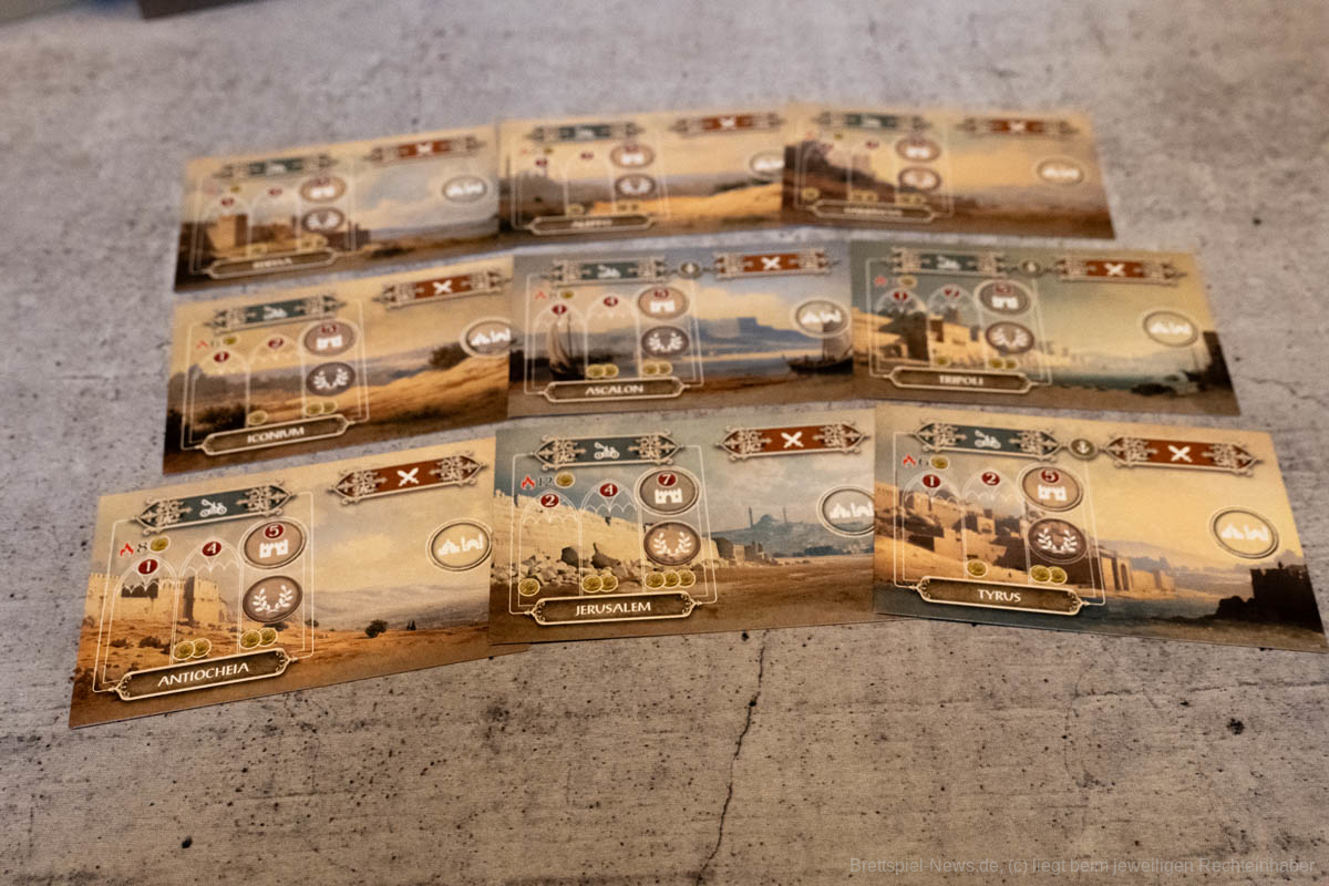 Thematisch entführt uns „Lords of Heaven“ in die Zeit der Kreuzzüge. Wir erleben die ersten beiden Kreuzzüge und können den Ausgang mit unseren Entscheidungen beeinflussen. Ich finde es sehr gut, dass sich getraut wurde auch die blutigen Episoden der Vergangenheit zu thematisieren. Ich persönlich bin in letzter Zeit zunehmend geschichtsinteressierter geworden und habe angefangen, Geschichtspodcasts zu hören. Dies war sicherlich auch ein Grund, weshalb mich das Spiel besonders interessiert hat, denn über die Kreuzzüge habe ich mir bisher wenig Gedanken gemacht. Leider verliert das Spiel etwas an Immersion, wenn keine epischen Schlachten geschlagen werden, sondern Würfel geworfen und anschließend Papptoken versetzt werden.